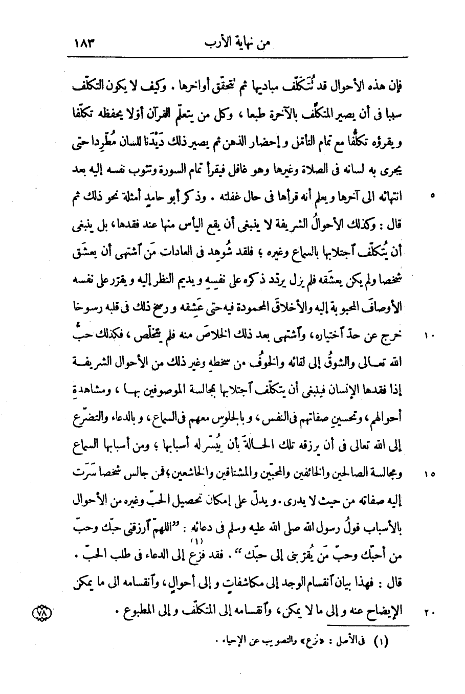 فإن هذه الأحوال قد تتكلّف مباديها ثم تتحقّق أواخرها. وكيف لا يكون التكلّف سببا في أن يصير المتكلّف بالآخرة طبعا، وكل من يتعلّم القرآن أوّلا يحفظه تكلّفا ويقرؤه تكلّفا مع تمام التأمّل وإحضار الذهن ثم يصير ذلك ديدنا للسان مطّردا حتى يجرى به لسانه في الصلاة وغيرها وهو غافل فيقرأ تمام السورة وتثوب نفسه إليه بعد انتهائه الى آخرها ويعلم أنه قرأها في حال غفلته. وذكر أبو حامد أمثلة نحو ذلك ثم قال: وكذلك الأحوال الشريفة لا ينبغى أن يقع اليأس منها عند فقدها، بل ينبغى أن يتكلّف اجتلابها بالسماع وغيره؛ فلقد شوهد في العادات من اشتهى أن يعشق شخصا ولم يكن يعشقه فلم يزل يردّد ذكره على نفسه ويديم النظر إليه ويقرّر على نفسه الأوصاف المحبوبة إليه والأخلاق المحمودة فيه حتى عشقه ورسخ ذلك في قلبه رسوخا خرج عن حدّ اختياره، واشتهى بعد ذلك الخلاص منه فلم يتخلّص، فكذلك حبّ الله تعالى والشوق إلى لقائه والخوف من سخطه وغير ذلك من الأحوال الشريفة إذا فقدها الإنسان فينبغى أن يتكلّف اجتلابها بمجالسة الموصوفين بها، ومشاهدة أحوالهم، وتحسين صفاتهم في النفس، وبالجلوس معهم في السماع، وبالدعاء والتضرّع إلى الله تعالى في أن يرزقه تلك الحالة بأن يسّر له أسبابها؛ ومن أسبابها السماع ومجالسة الصالحين والخائفين والمحبّين والمشتاقين والخاشعين؛ فمن جالس شخصا سرت إليه صفاته من حيث لا يدرى. ويدلّ على إمكان تحصيل الحبّ وغيره من الأحوال بالأسباب قول رسول الله صلّى الله عليه وسلّم في دعائه: «اللهمّ ارزقنى حبّك وحبّ من أحبّك وحبّ من يقرّبنى إلى حبّك» . فقد فزع «1» إلى الدعاء في طلب الحبّ.
