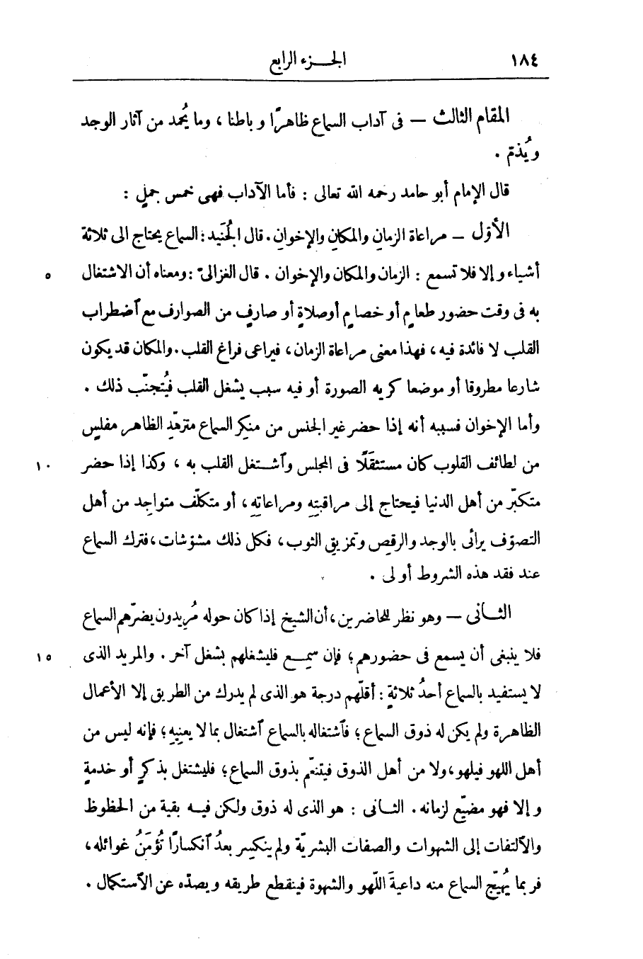 المقام الثالث- فى آداب السماع ظاهرا وباطنا، وما يحمد من آثار الوجد ويذمّ.