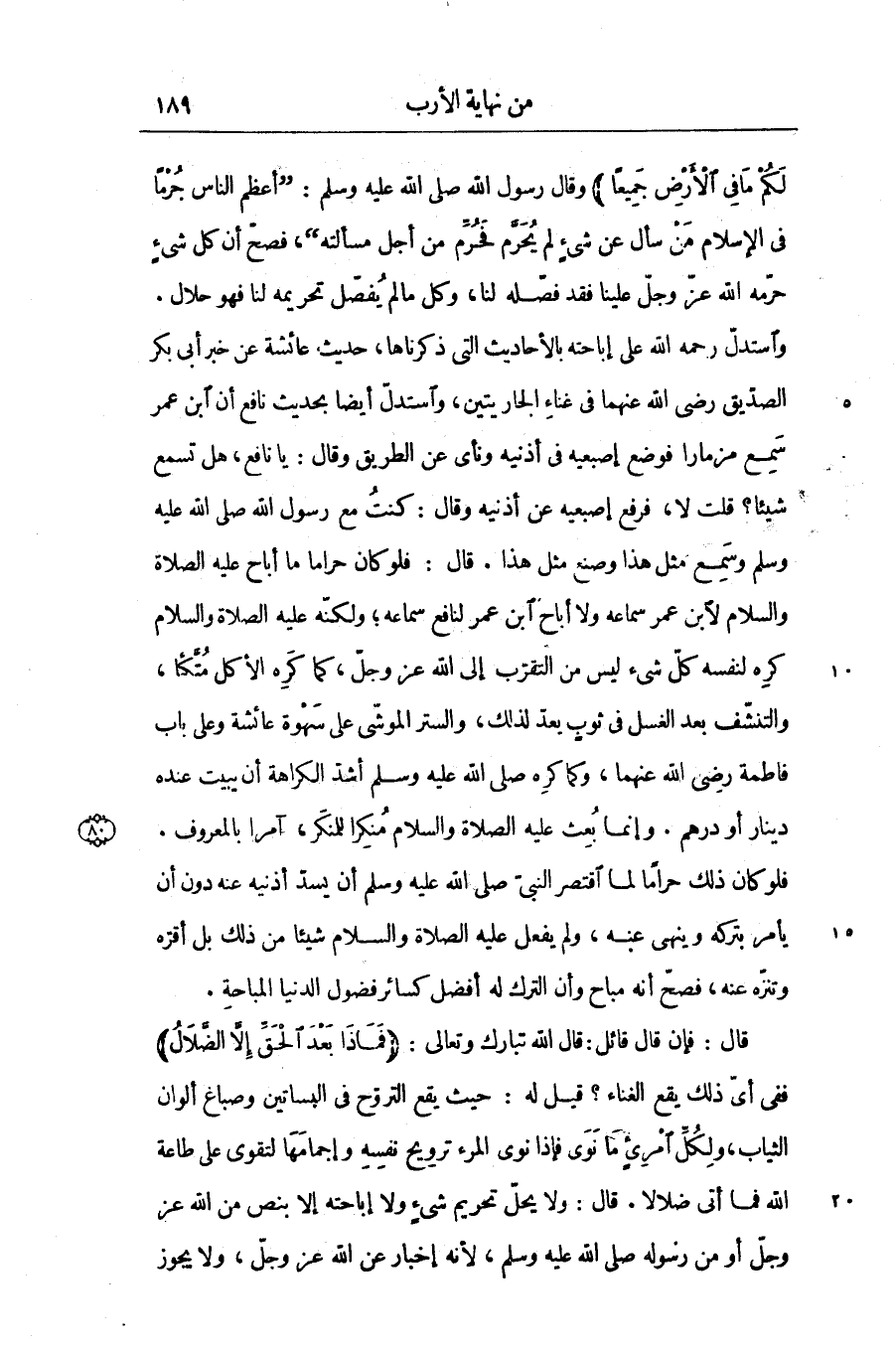 ففى أىّ ذلك يقع الغناء؟ قيل له: حيث يقع التروّح في البساتين وصباغ ألوان الثياب؛ ولكلّ امرىء ما نوى فإذا نوى المرء ترويح نفسه وإجمامها لتقوى على طاعة الله فما أتى ضلالا. قال: ولا يحلّ تحريم شىء ولا إباحته إلا بنص من الله عز وجلّ أو من رسوله صلّى الله عليه وسلم، لأنه إخبار عن الله عز وجلّ، ولا يجوز
