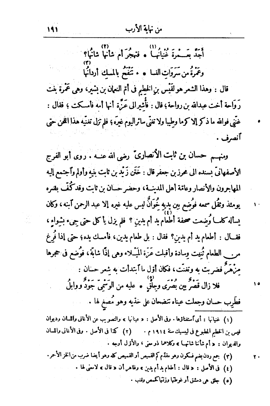 ومنهم حسان بن ثابت الأنصارىّ رضى الله عنه. روى أبو الفرج الأصفهانىّ بسنده الى محرز بن جعفر قال: ختن زيد بن ثابت بنيه وأو لم واجتمع إليه المهاجرون والأنصار وعامّة أهل المدينة، وحضر حسان بن ثابت وقد كفّ بصره يومئذ وثقل سمعه فوضع بين يديه خوان ليس عليه غيره إلا عبد الرحمن ابنه، وكان يسأله كلما وضعت صحفة أطعام «4» يد أم يدين؟ فلم يزل يأكل حتى جىء بشواء، فقال: أطعام يد أم يدين؟ فقال: بل طعام يدين، فأمسك يده؛ حتى إذا فرغ من الطعام ثنيت وسادة وأقبلت عزّة الميلاء وهى إذا شابّة، فوضع في حجرها مزهر فضربت به وتغنّت، فكان أوّل ما ابتدأت به شعر حسان: