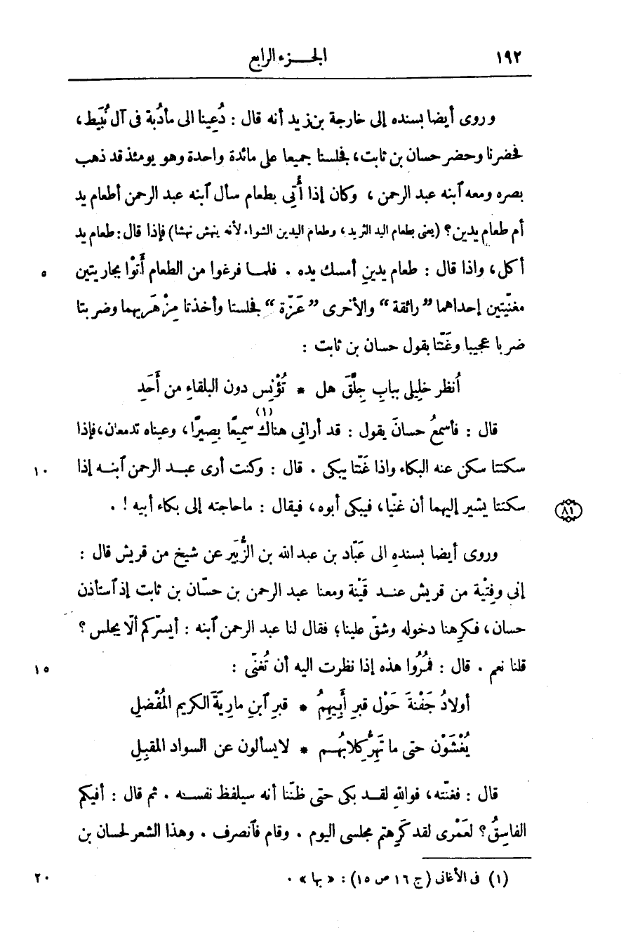 وروى أيضا بسنده إلى خارجة بن زيد أنه قال: دعينا الى مأدبة في آل نبيط، فحضرنا وحضر حسان بن ثابت، فجلسنا جميعا على مائدة واحدة وهو يومئذ قد ذهب بصره ومعه ابنه عبد الرحمن، وكان إذا أتى بطعام سأل ابنه عبد الرحمن أطعام يد أم طعام يدين؟ (يعنى بطعام اليد الثريد؛ وطعام اليدين الشواء لأنه ينهش نهشا) فإذا قال: طعام يد أكل، واذا قال: طعام يدين أمسك يده. فلما فرغوا من الطعام أتوا بجاريتين مغنّيتين إحداهما «رائقة» والأخرى «عزّة» فجلستا وأخذتا مزهريهما وضربتا ضربا عجيبا وغنّتا بقول حسان بن ثابت: