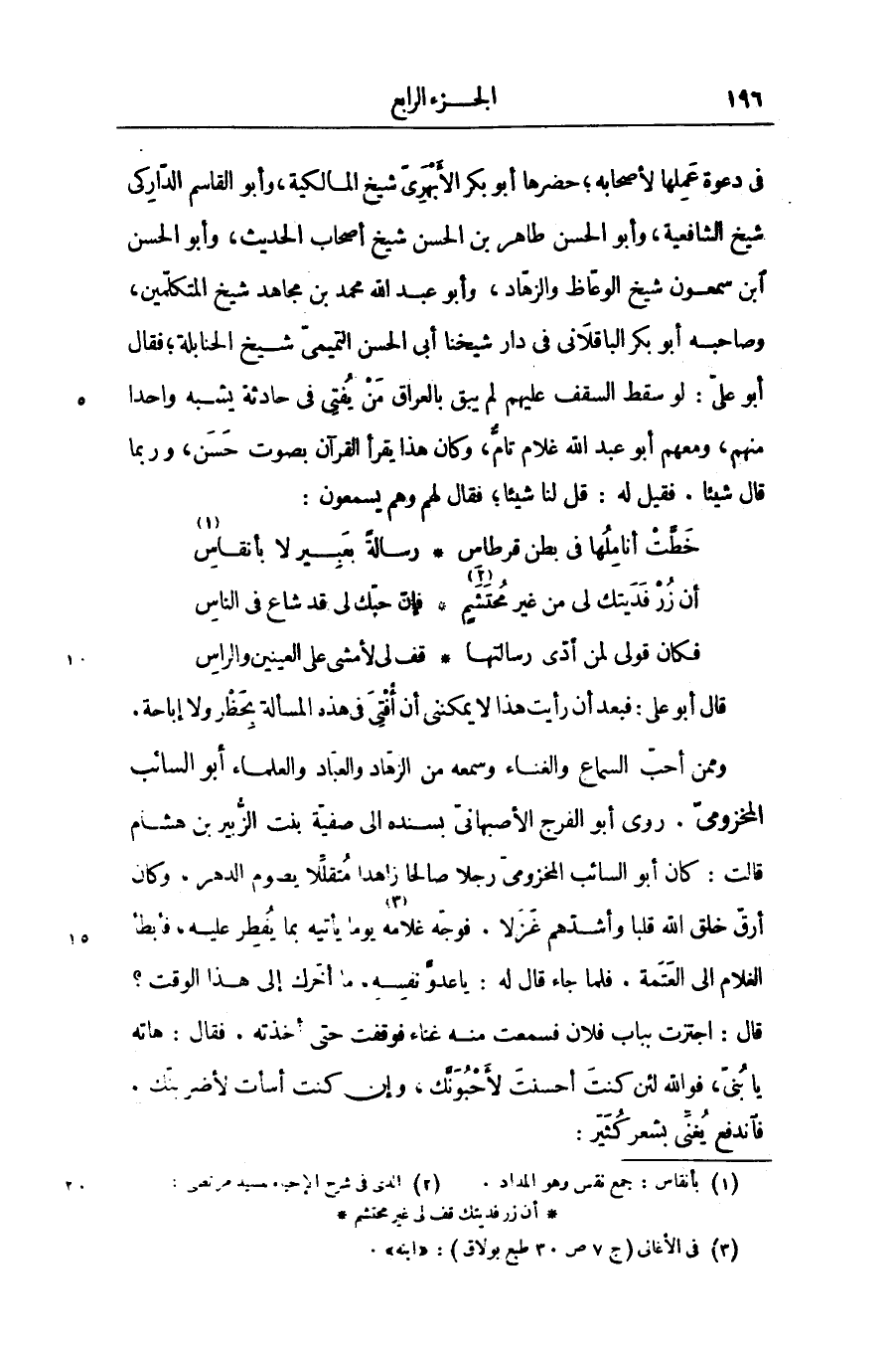 وممن أحبّ السماع والغناء وسمعه من الزهاد والعباد والعلماء أبو السائب المخزومىّ. روى أبو الفرج الأصبهانىّ بسنده الى صفيّة بنت الزّبير بن هشام قالت: كان أبو السائب المخزومى رجلا صالحا زاهدا متقلّلا يصوم الدهر، وكان أرقّ خلق الله قلبا وأشدّهم غزلا. فوجّه غلامه «3» يوما يأتيه بما يفطر عليه، فأبطأ الغلام الى العتمة. فلما جاء قال له: يا عدوّ نفسه، ما أخّرك إلى هذا الوقت؟