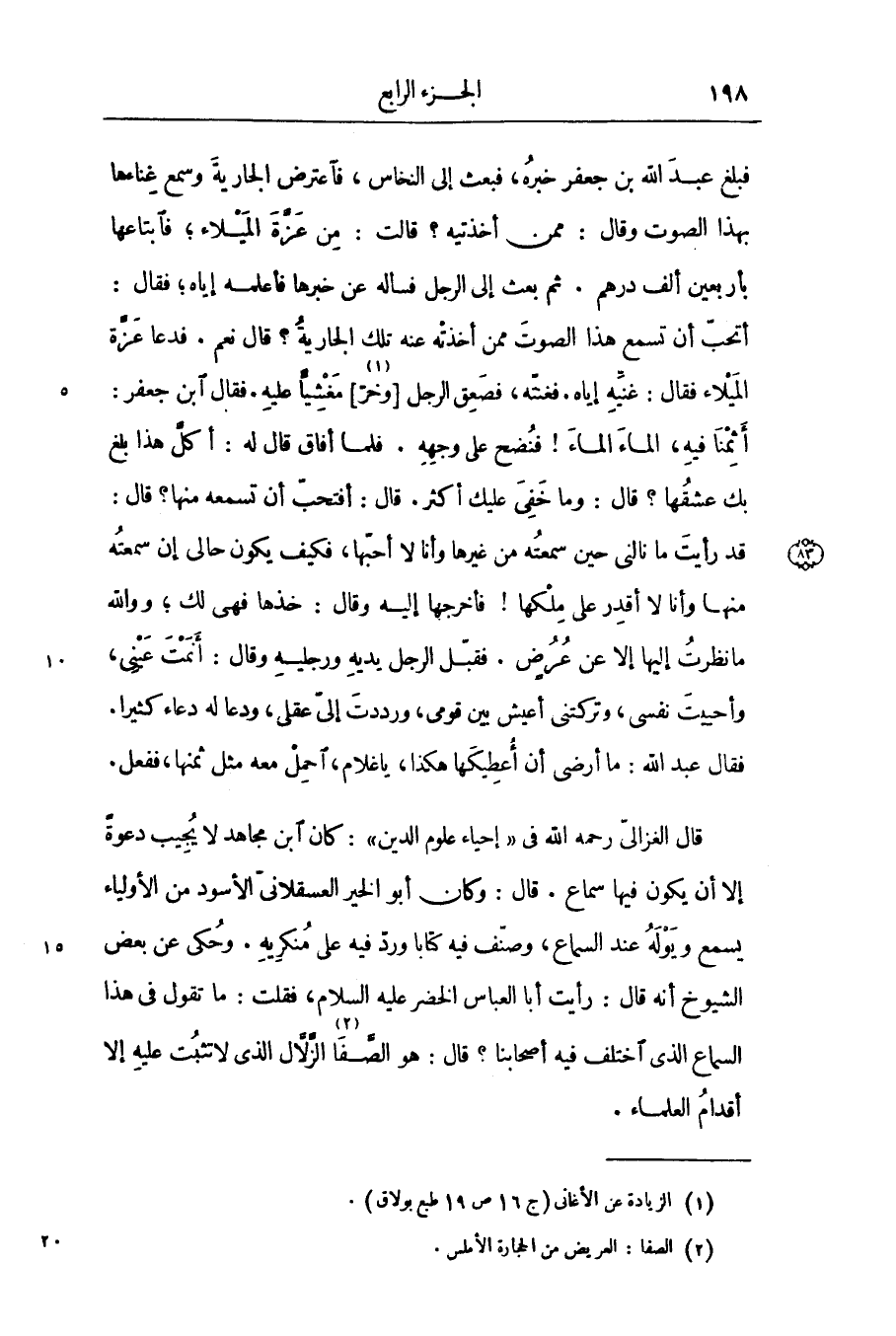 قال الغزالىّ رحمه الله في «إحياء علوم الدين» : كان ابن مجاهد لا يجيب دعوة إلا أن يكون فيها سماع. قال: وكان أبو الخير العسقلانىّ الأسود من الأولياء يسمع ويوله عند السماع، وصنّف فيه كتابا وردّ فيه على منكريه. وحكى عن بعض الشيوخ أنه قال: رأيت أبا العباس الخضر عليه السّلام، فقلت: ما تقول في هذا السماع الذى اختلف فيه أصحابنا؟ قال: هو الصّفا «2» الزّلّال الذى لا تثبت عليه إلا أقدام العلماء.