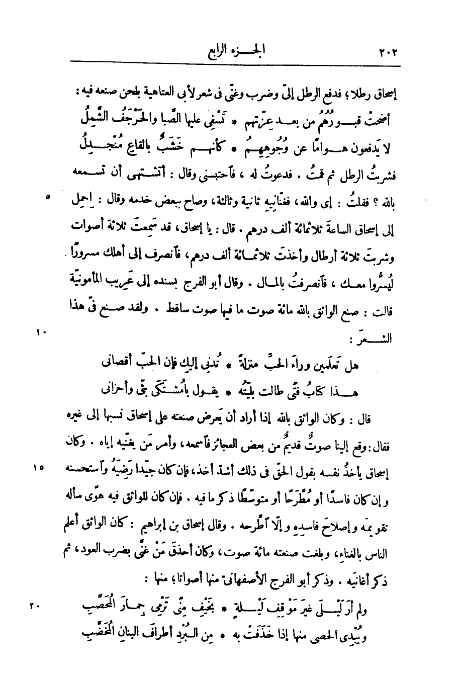 فشربت الرطل ثم قمت. فدعوت له، فاحتبسنى وقال: أتشتهى أن تسمعه بالله؟ فقلت: إى والله، فغنّانيه ثانية وثالثة، وصاح ببعض خدمه وقال: احمل إلى إسحاق الساعة ثلاثمائة ألف درهم. قال: يا إسحاق، قد سمعت ثلاثة أصوات وشربت ثلاثة أرطال وأخذت ثلاثمائة ألف درهم، فانصرف إلى أهلك مسرورا ليسّروا معك، فانصرفت بالمال. وقال أبو الفرج بسنده إلى عريب المأمونيّة قالت: صنع الواثق بالله مائة صوت ما فيها صوت ساقط. ولقد صنع فيّ هذا الشعر: