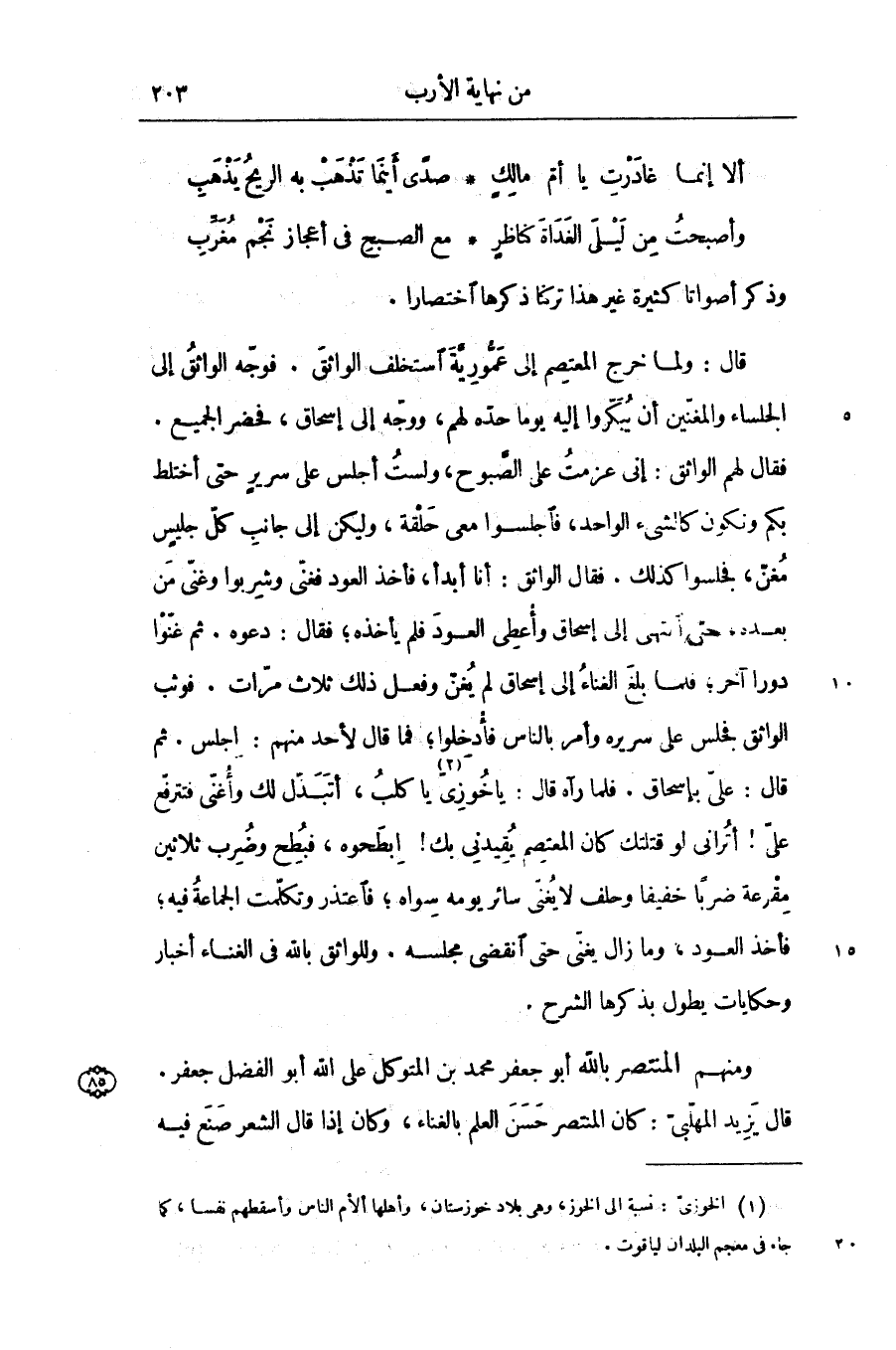فقال لهم الواثق: إنى عزمت على الصّبوح، ولست أجلس على سرير حتى أختلط بكم ونكون كالشىء الواحد، فاجلسوا معى حلقة، وليكن إلى جانب كلّ جليس مغنّ، فجلسوا كذلك. فقال الواثق: أنا أبدأ، فأخذ العود فغنّى وشربوا وغنّى من بعده، حتى انتهى إلى إسحاق وأعطى العود فلم يأخذه؛ فقال: دعوه. ثم غنوا دورا آخر؛ فلما بلغ الغناء إلى إسحاق لم يغنّ وفعل ذلك ثلاث مرّات. فوثب الواثق فجلس على سريره وأمر بالناس فأدخلوا؛ فما قال لأحد منهم: اجلس. ثم قال: علىّ بإسحاق. فلما رآه قال: يا خوزى «1» يا كلب، أتبذّل لك وأغنّى فتترفّع علىّ! أترانى لو قتلتك كان المعتصم يقيدنى بك! ابطحوه، فبطح وضرب ثلاثين مقرعة ضربا خفيفا وحلف لا يغنّى سائر يومه سواه؛ فاعتذر وتكلّمت الجماعة فيه؛ فأخذ العود، وما زال يغنّى حتى انقضى مجلسه. وللواثق بالله في الغناء أخبار وحكايات يطول بذكرها الشرح.