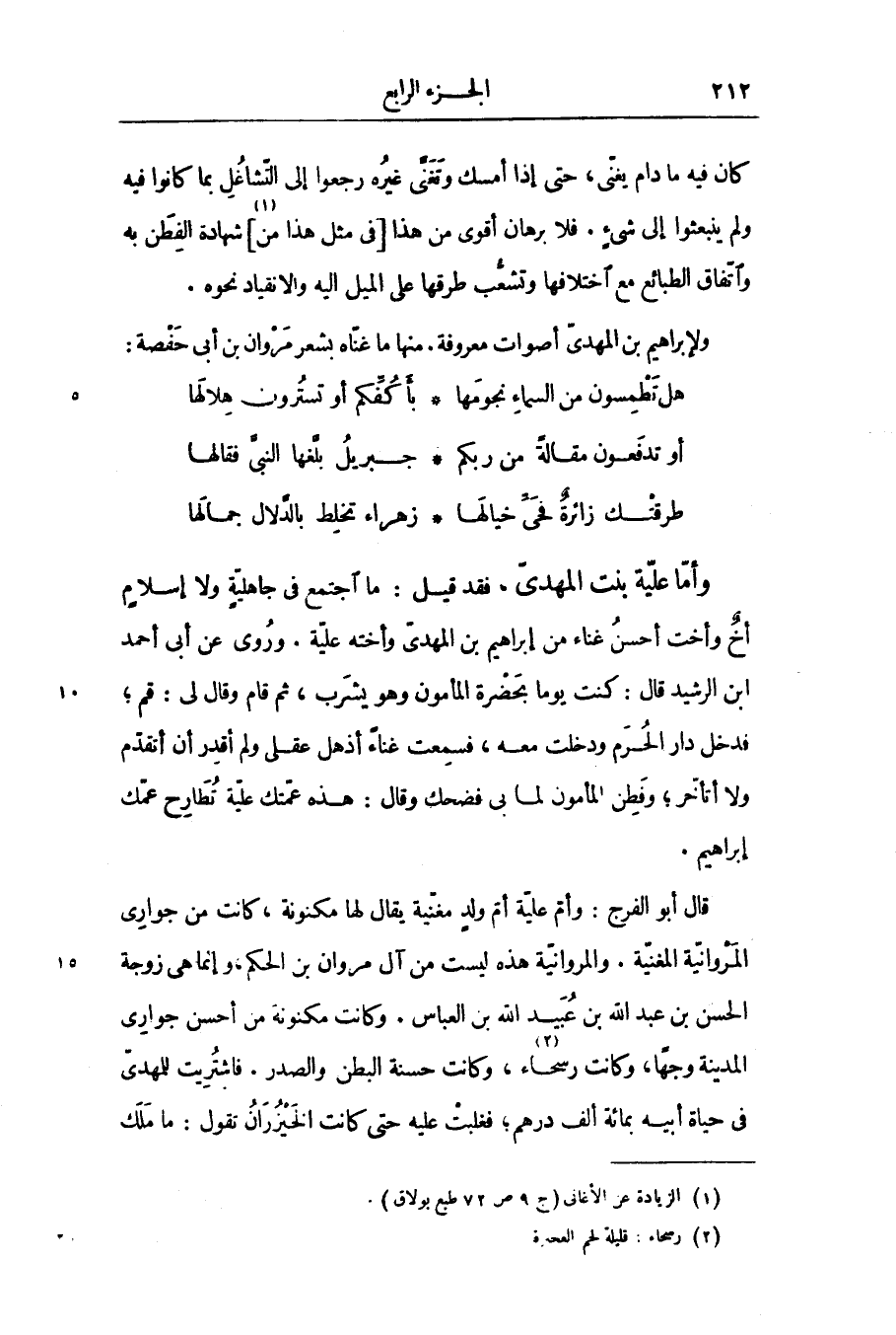 فقد قيل: ما اجتمع في جاهليّة ولا إسلام أخ وأخت أحسن غناء من إبراهيم بن المهدىّ وأخته عليّة. وروى عن أبى أحمد ابن الرشيد قال: كنت يوما بحضرة المأمون وهو يشرب، ثم قام وقال لى: قم؛ فدخل دار الحرم ودخلت معه، فسمعت غناء أذهل عقلى ولم أقدر أن أتقدّم ولا أتأخّر؛ وفطن المأمون لما بى فضحك وقال: هذه عمّتك عليّة تطارح عمّك إبراهيم.