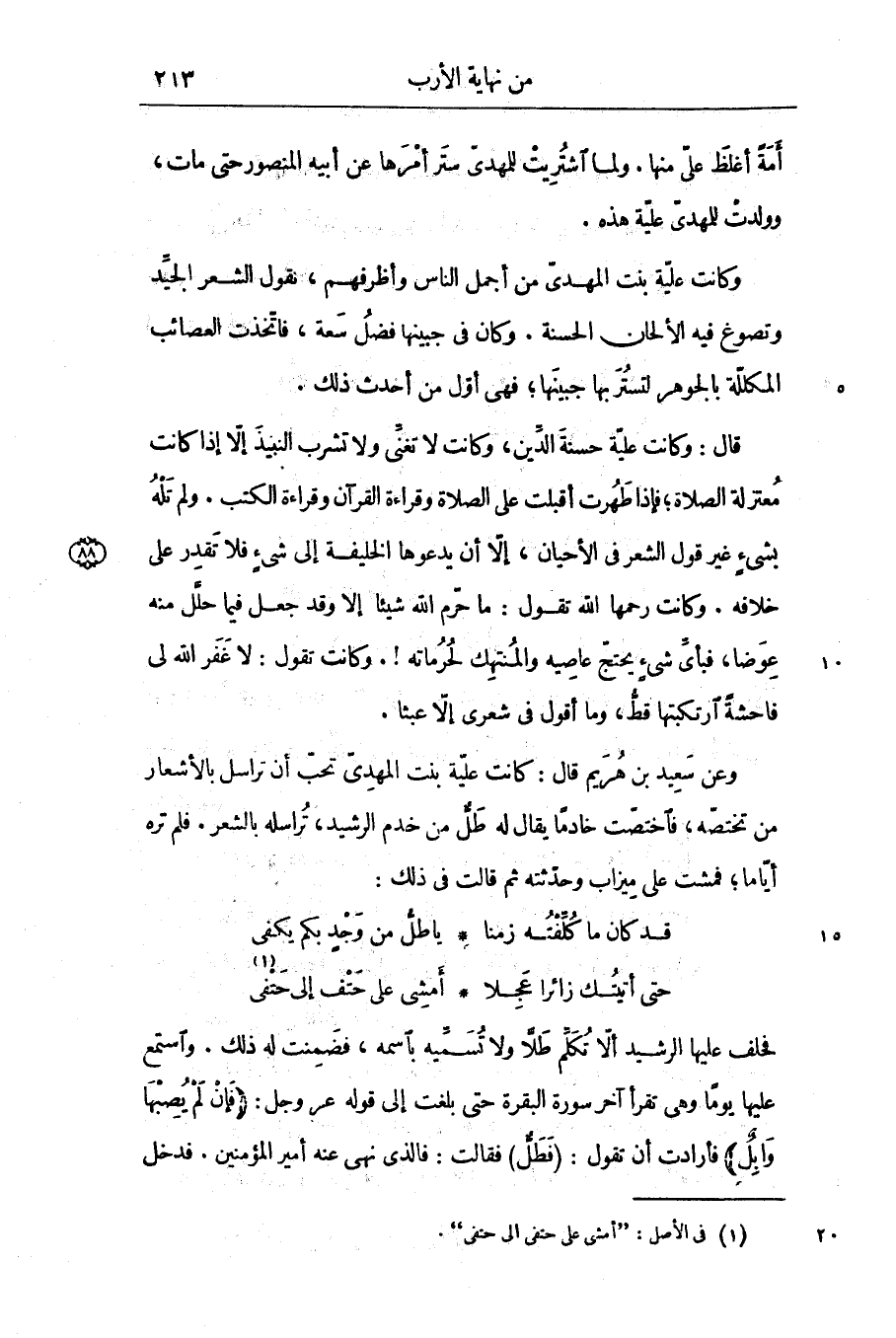 وكانت عليّة بنت المهدىّ من أجمل الناس وأظرفهم، نقول الشعر الجيّد وتصوغ فيه الألحان الحسنة. وكان في جبينها فضل سعة، فاتّخذت العصائب المكللّة بالجوهر لتستربها جبينها؛ فهى أوّل من أحدث ذلك.