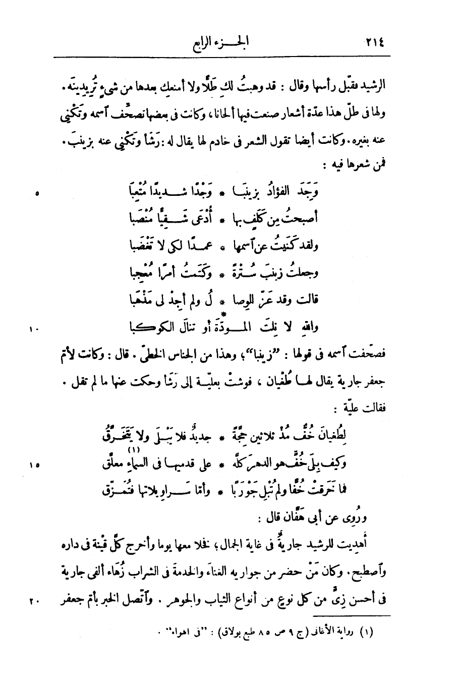 فصحّفت اسمه في قولها: «زينبا» ؛ وهذا من الجناس الخطّى. قال: وكانت لأمّ جعفر جارية يقال لها طغيان، فوشت بعليّة إلى رشأ وحكت عنها ما لم تقل.
