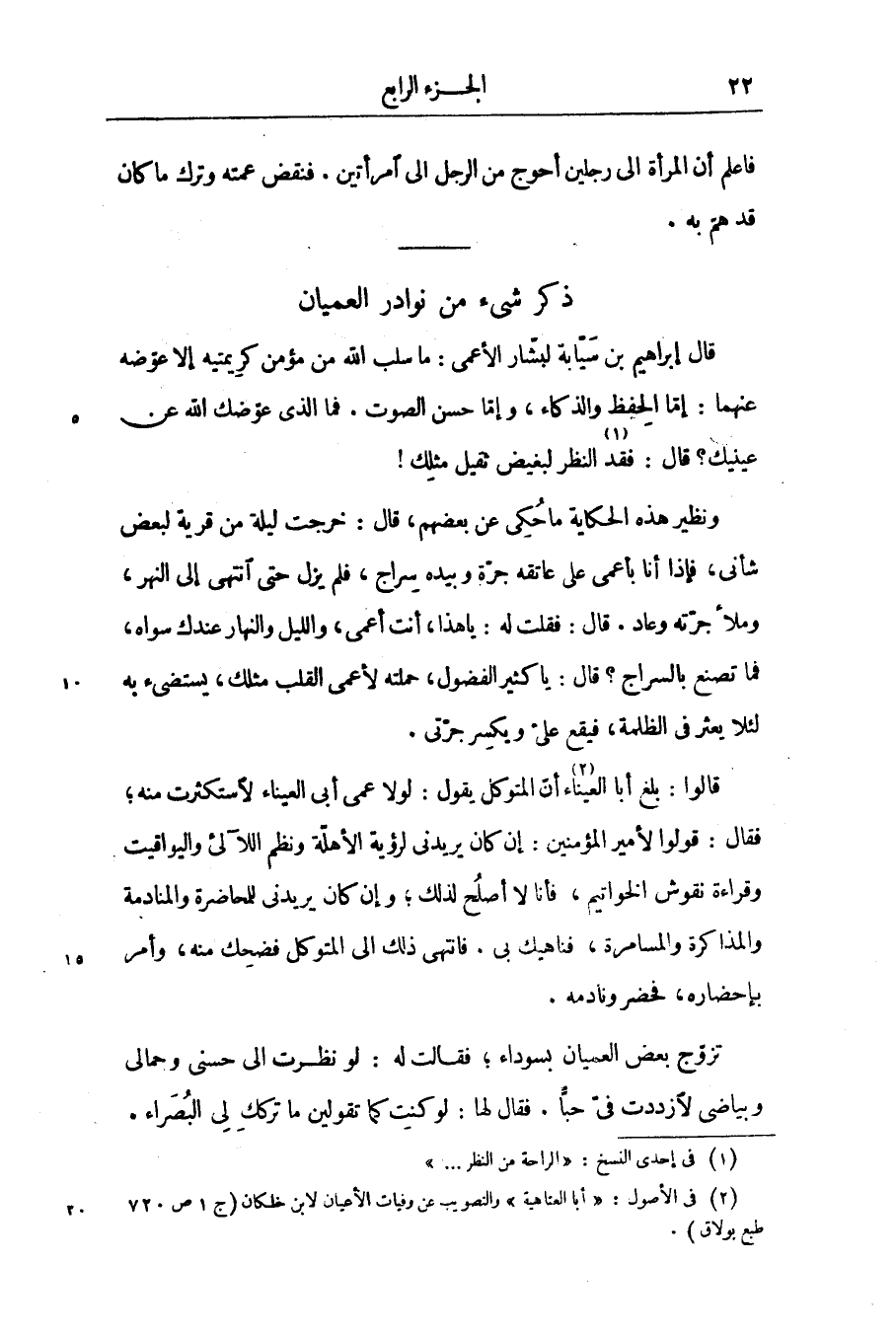 قال إبراهيم بن سيابة لبشّار الأعمى: ما سلب الله من مؤمن كريمتيه إلا عوّضه عنهما: إمّا الحفظ والذكاء، وإمّا حسن الصوت. فما الذى عوّضك الله عن عينيك؟ قال: فقد «1» النظر لبغيض ثقيل مثلك! ونظير هذه الحكاية ما حكى عن بعضهم، قال: خرجت ليلة من قرية لبعض شأنى، فإذا أنا بأعمى على عاتقه جرّة وبيده سراج، فلم يزل حتى انتهى إلى النهر، وملأ جرّته وعاد. قال: فقلت له: يا هذا، أنت أعمى، والليل والنهار عندك سواه، فما تصنع بالسراج؟ قال: يا كثير الفضول، حملته لأعمى القلب مثلك، يستضىء به لئلا يعثر في الظلمة، فيقع علىّ ويكسر جرّتى.