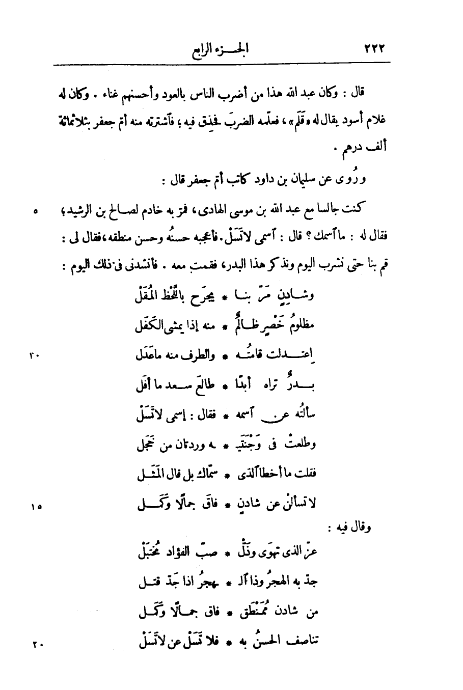 قال: وكان عبد الله هذا من أضرب الناس بالعود وأحسنهم غناء. وكان له غلام أسود يقال له «قلم» ، فعلّمه الضرب فحذق فيه؛ فاشترته منه أمّ جعفر بثلاثمائة ألف درهم.