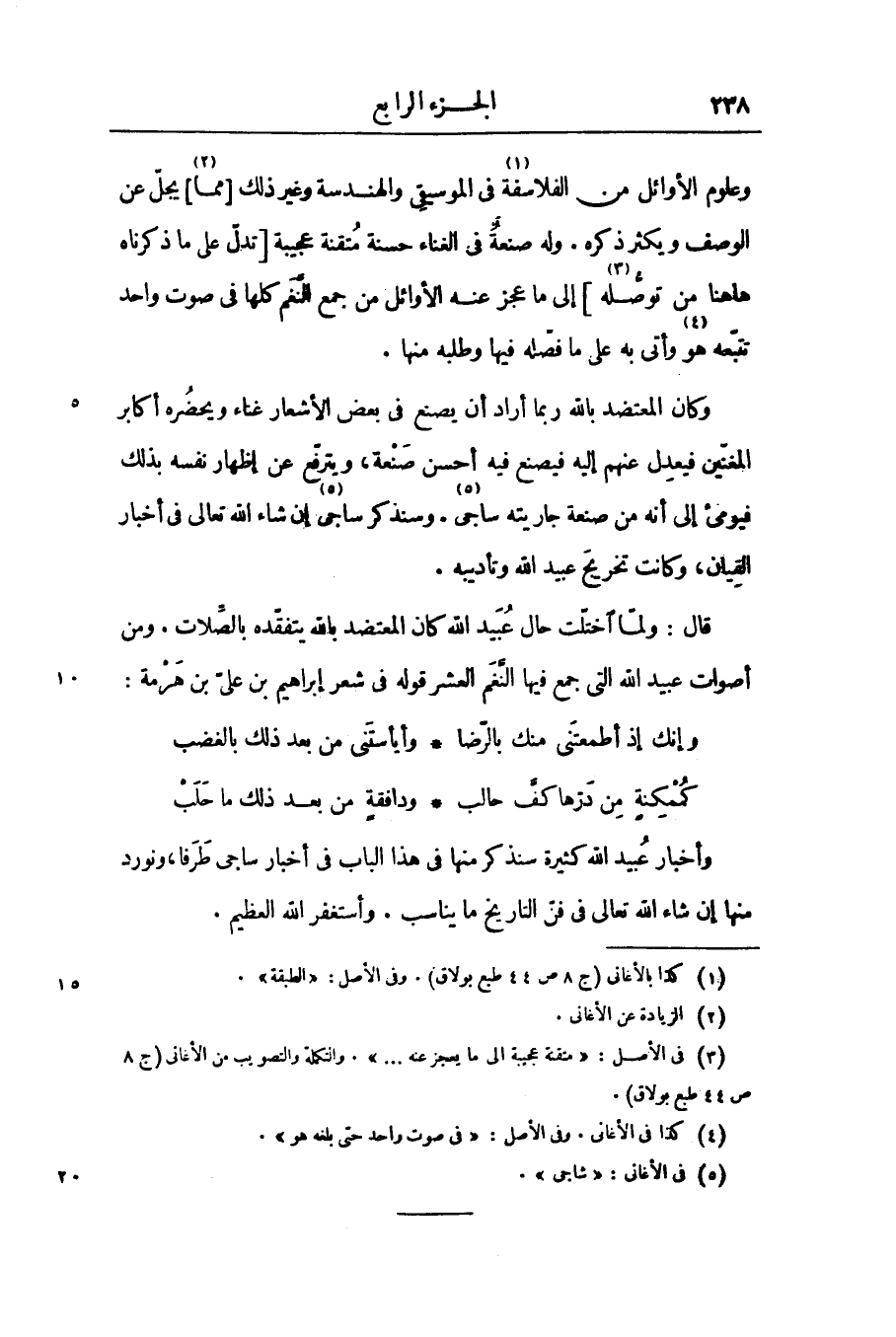 وعلوم الأوائل من الفلاسفة «1» فى الموسيقى والهندسة وغير ذلك [مما «2» ] يجلّ عن الوصف ويكثر ذكره. وله صنعة في الغناء حسنة متقنة عجيبة [تدلّ على ما ذكرناه هاهنا من توصّله «3» ] إلى ما عجز عنه الأوائل من جمع النّغم كلها في صوت واحد تتّبعه هو «4» وأتى به على ما فصّله فيها وطلبه منها.