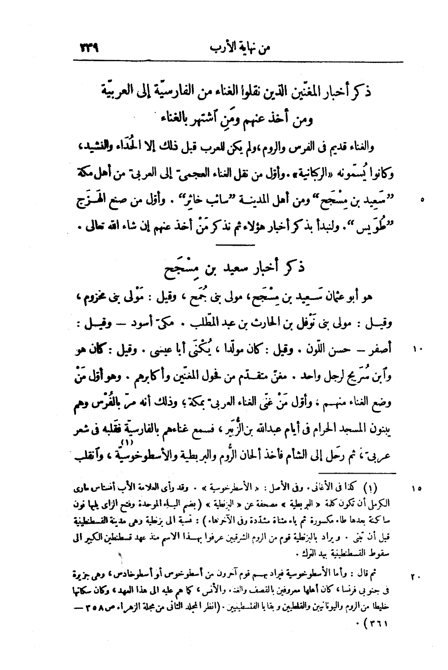 والغناء قديم في الفرس والروم، ولم يكن للعرب قبل ذلك إلا الحداء والنشيد، وكانوا يسمّونه «الركبانية» . وأوّل من نقل الغناء العجمىّ إلى العربىّ من أهل مكة «سعيد بن مسجح» ومن أهل المدينة «سائب خاثر» . وأوّل من صنع الهزج «طويس» . ولنبدأ بذكر أخبار هؤلاء ثم نذكر من أخذ عنهم إن شاء الله تعالى.