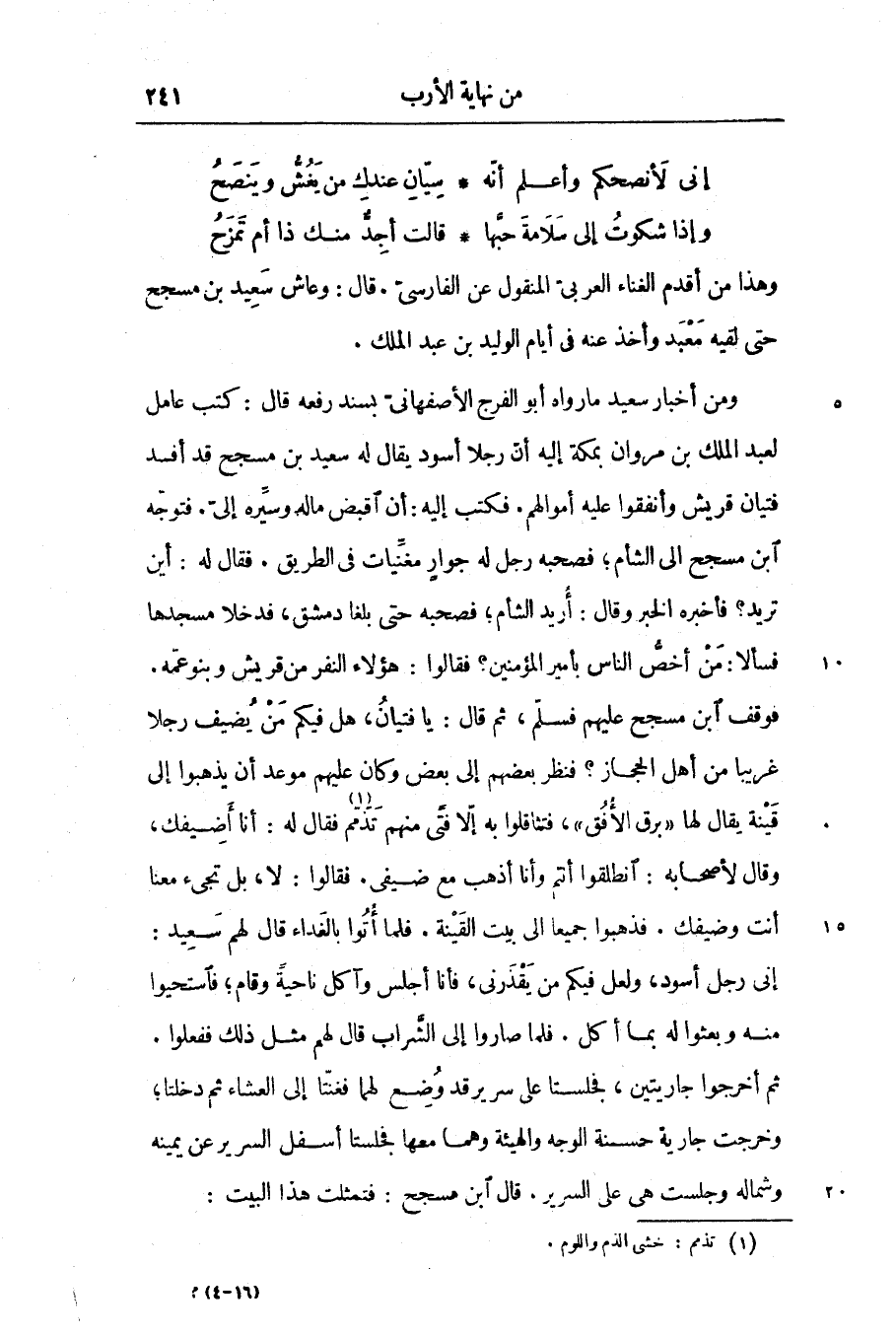 وهذا من أقدم الغناء العربىّ المنقول عن الفارسىّ. قال: وعاش سعيد بن مسجح حتى لقيه معبد وأخذ عنه في أيام الوليد بن عبد الملك.