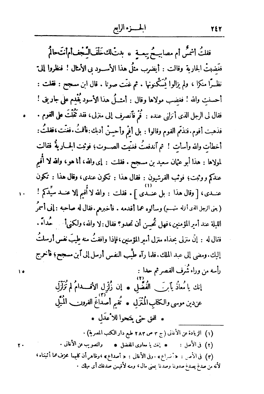 فغضبت الجارية وقالت: أيضرب مثل هذا الأسود بى الأمثال! فنظروا إلىّ نظرا منكرا، ولم يزالوا يسكّنونها. ثم غنّت صوتا. قال ابن مسجح: فقلت: