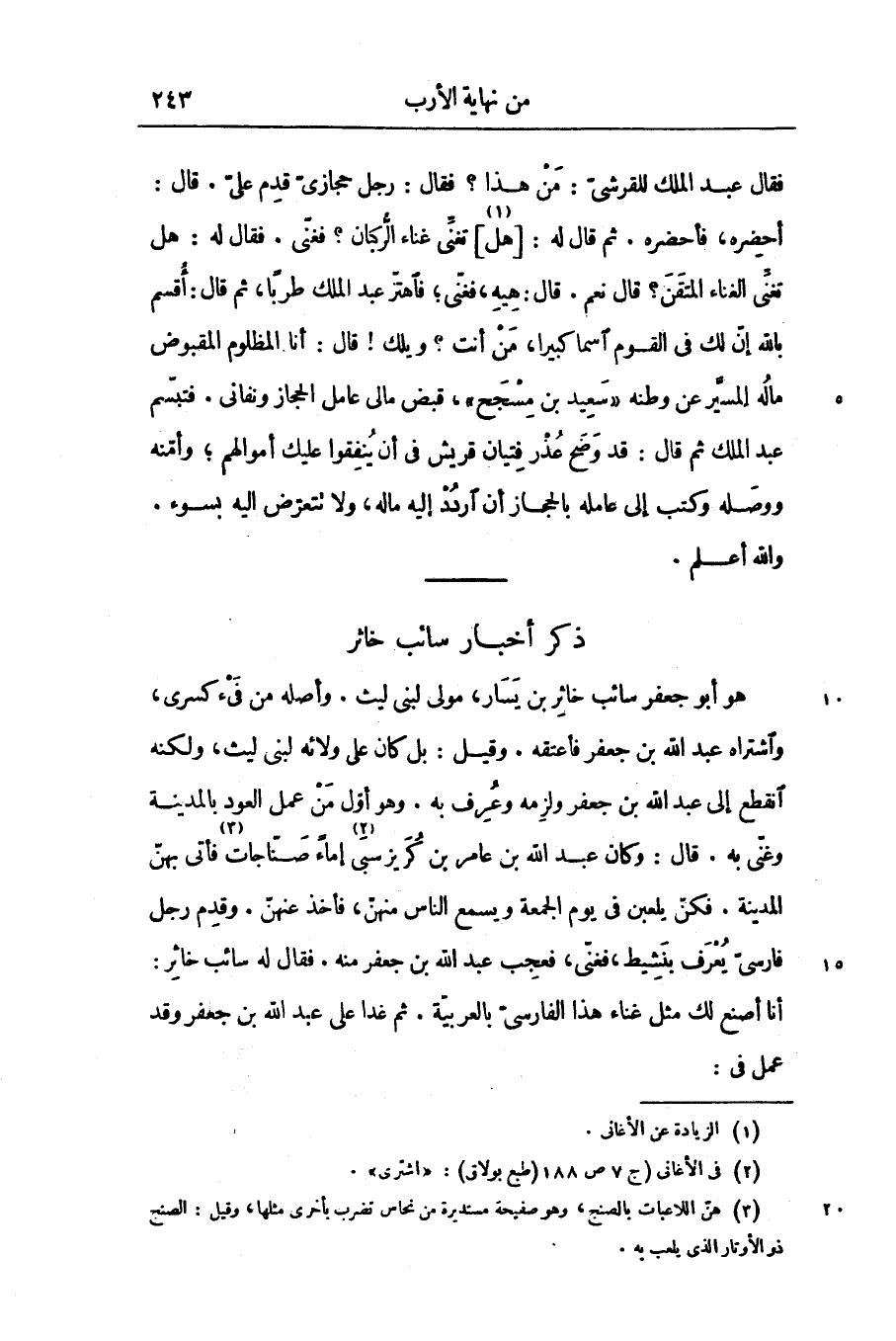 هو أبو جعفر سائب خاثر بن يسار، مولى لبنى ليث. وأصله من فيء كسرى، واشتراه عبد الله بن جعفر فأعتقه. وقيل: بل كان على ولائه لبنى ليث، ولكنه انقطع إلى عبد الله بن جعفر ولزمه وعرف به. وهو أوّل من عمل العود بالمدينة وغنّى به. قال: وكان عبد الله بن عامر بن كريز سبىّ «2» إماء صنّاجات «3» فأتى بهنّ المدينة. فكنّ يلعبن في يوم الجمعة ويسمع الناس منهنّ، فأخذ عنهنّ. وقدم رجل فارسىّ يعرف بنشيط، فغنّى، فعجب عبد الله بن جعفر منه. فقال له سائب خاثر: