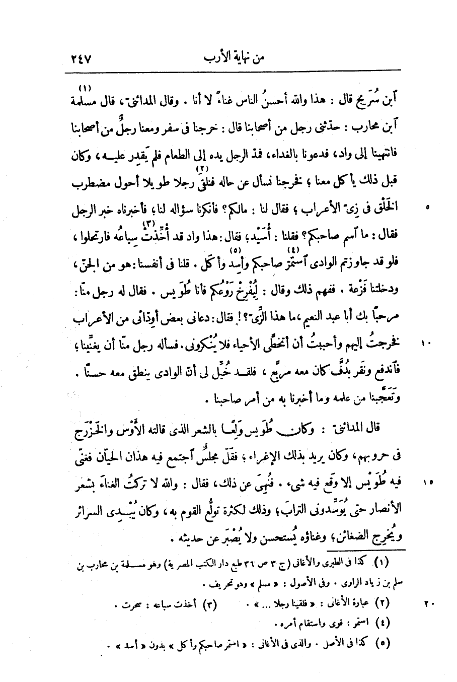 مرحبا بك أبا عبد النعيم، ما هذا الزّىّ؟! فقال: دعانى بعض أودّائى من الأعراب فخرجت إليهم وأحببت أن أتخطّى الأحياء فلا ينكرونى. فسأله رجل منّا أن يغنّينا؛ فاندفع ونقر بدفّ كان معه مربّع، فلقد خيّل لى أنّ الوادى ينطق معه حسنا.