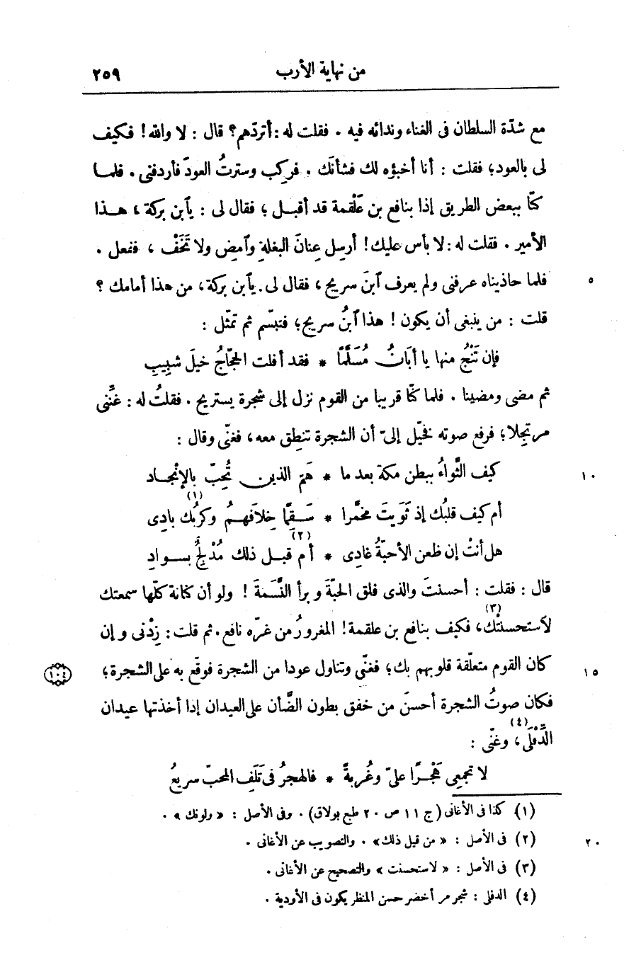 قال: فقلت: أحسنت والذى فلق الحبّة وبرأ النّسمة! ولو أن كنانة كلّها سمعتك لاستحسنتك «3» ، فكيف بنافع بن علقمة! المغرور من غرّه نافع. ثم قلت: زدنى وإن كان القوم متعلّقة قلوبهم بك؛ فغنّى وتناول عودا من الشجرة فوقّع به على الشجرة؛ فكان صوت الشجرة أحسن من خفق بطون الضّأن على العيدان إذا أخذتها عيدان الدّفلى «4» ، وغنّى: