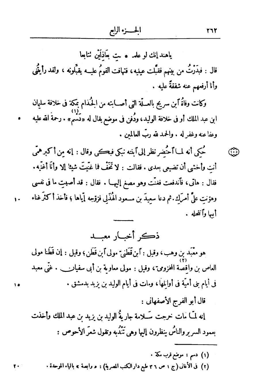 هو معبد بن وهب، وقيل: ابن قطنىّ مولى ابن قطن؛ وقيل: إن قطنا مولى العاص بن واقصة «2» المخزومىّ، وقيل: مولى معاوية بن أبى سفيان. غنّى معبد فى أيام بنى أميّة في أوائلها، ومات في أيام الوليد بن يزيد بدمشق.