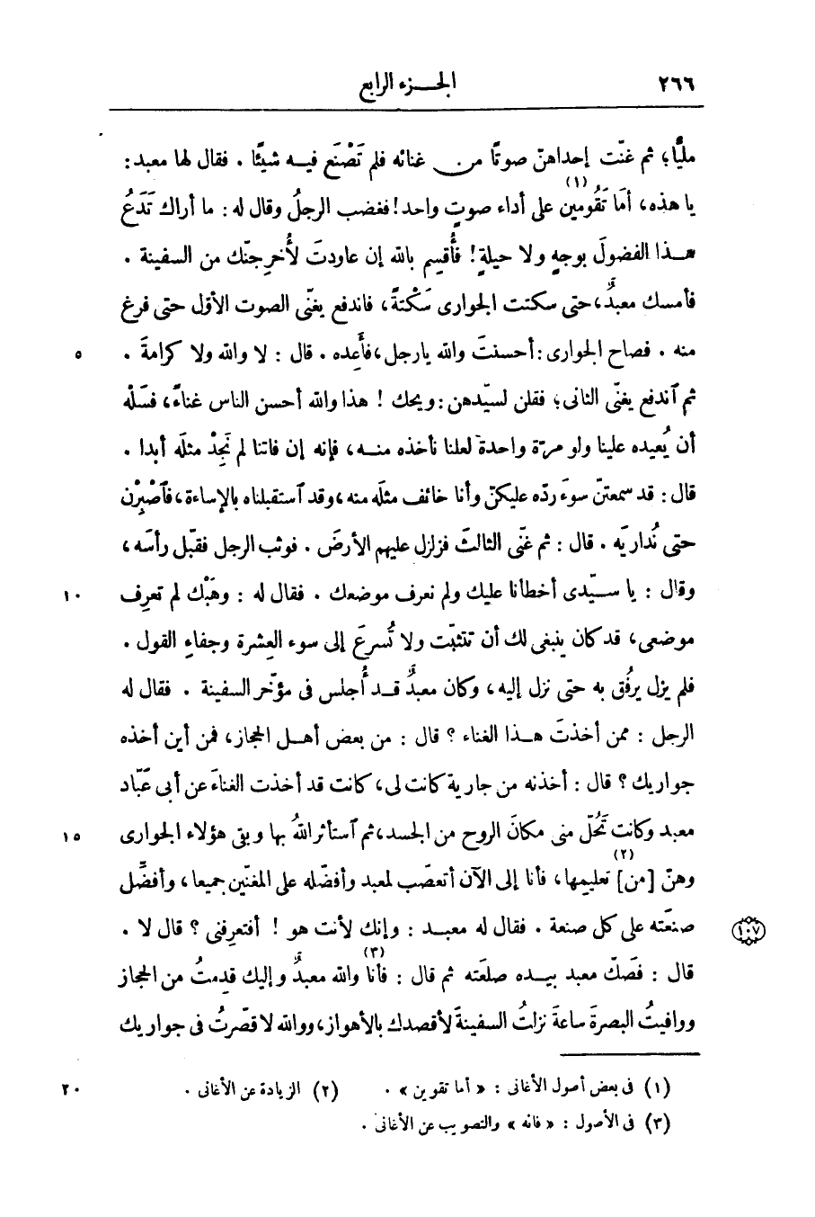 فلم يزل يرفق به حتى نزل إليه، وكان معبد قد أجلس في مؤخّر السفينة. فقال له الرجل: ممن أخذت هذا الغناء؟ قال: من بعض أهل الحجاز، فمن أين أخذه جواريك؟ قال: أخذنه من جارية كانت لى، كانت قد أخذت الغناء عن أبى عبّاد معبد وكانت تحلّ منى مكان الروح من الجسد، ثم استأثر الله بها وبقى هؤلاء الجوارى وهنّ [من «2» ] تعليمها، فأنا إلى الآن أتعصّب لمعبد وأفضّله على المغنّين جميعا، وأفضّل صنعته على كل صنعة. فقال له معبد: وإنك لأنت هو! أفتعرفنى؟ قال لا.