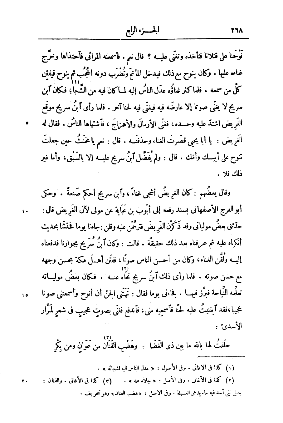 نوحنا على قتلانا فتأخذه وتغنّى عليه؟ قال نعم. فأسمعنه المراثى فآحتذاها وخرّج غناءه عليها. وكان ينوح مع ذلك فيدخل المآتم وتضرب دونه الحجب ثم ينوح فيفتن كلّ من سمعه. فلما كثر غناؤه عدل الناس إليه لما كان فيه من الشّجا «1» ؛ فكان ابن سريج لا يغنّى صوتا إلا عارضه فيه فيغنّى فيه لحنا آخر. فلما رأى ابن سريج موقع الغريض اشتدّ عليه وحسده، فغنّى الأرمال والأهزاج، فاشتهاها الناس. فقال له الغريض: يا أبا يحيى قصّرت الغناء وحذفته. قال: نعم يا مخنّث حين جعلت تنوح على أبيك وأمّك. قال: ولم يفضّل ابن سريج عليه إلا بالسّبق، وأما غير ذلك فلا.