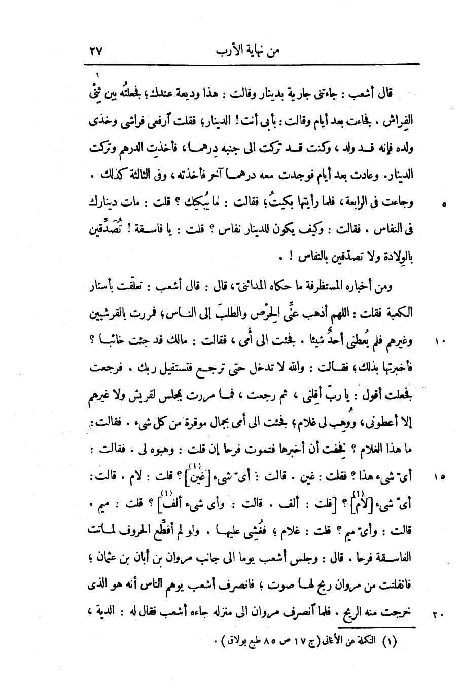 قال أشعب: جاءتنى جارية بدينار وقالت: هذا وديعة عندك؛ فجعلته بين ثنى الفراش. فجاءت بعد أيام وقالت: بأبى أنت! الدينار؛ فقلت ارفعى فراشى وخذى ولده فإنه قد ولد، وكنت قد تركت الى جنبه درهما، فأخذت الدرهم وتركت الدينار. وعادت بعد أيام فوجدت معه درهما آخر فأخذته، وفي الثالثة كذلك.