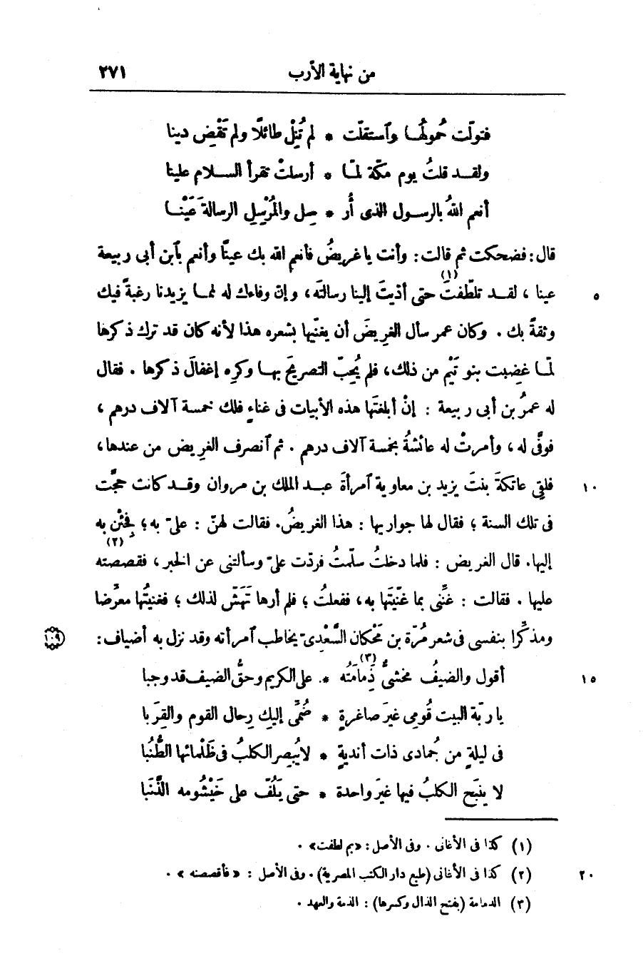قال: فضحكت ثم قالت: وأنت يا غريض فأنعم الله بك عينا وأنعم بابن أبى ربيعة عينا، لقد تلطّفت «1» حتى أدّيت إلينا رسالته، وإنّ وفاءك له لمما يزيدنا رغبة فيك وثقة بك. وكان عمر سأل الغريض أن يغنّيها بشعره هذا لأنه كان قد ترك ذكرها لمّا غضبت بنو تيم من ذلك، فلم يحبّ التصريح بها وكره إغفال ذكرها. فقال له عمر بن أبى ربيعة: إن أبلغتها هذه الأبيات في غناء فلك خمسة آلاف درهم، فوفّى له، وأمرت له عائشة بخمسة آلاف درهم. ثم انصرف الغريض من عندها، فلقى عاتكة بنت يزيد بن معاوية امرأة عبد الملك بن مروان وقد كانت حجّت فى تلك السنة؛ فقال لها جواريها: هذا الغريض. فقالت لهنّ: علىّ به؛ فجئن به إليها. قال الغريض: فلما دخلت سلّمت فردّت علىّ وسألتنى عن الخبر، فقصصته «2» عليها. فقالت: غنّنى بما غنّيتها به، ففعلت؛ فلم أرها تهشّ لذلك؛ فغنيتها معرّضا ومذكّرا بنفسى في شعر مرّة بن محكان السّعدىّ يخاطب امرأته وقد نزل به أضياف:
