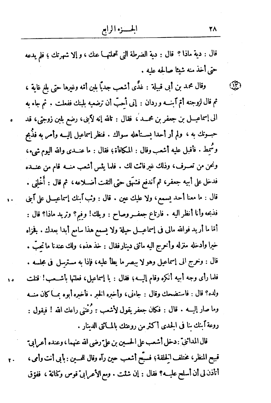 فلما رأى وجه أبيه أنكره وقام إليه؛ فقال: يا إسماعيل، فعلتها بأشعب! قتلت ولده؟ قال: فاستضحك وقال: جاءنى، وأخبره الخبر. فأخبره أبوه بما كان منه وما صار إليه. قال: فكان جعفر يقول لأشعب: رعتنى راعك الله! فيقول: