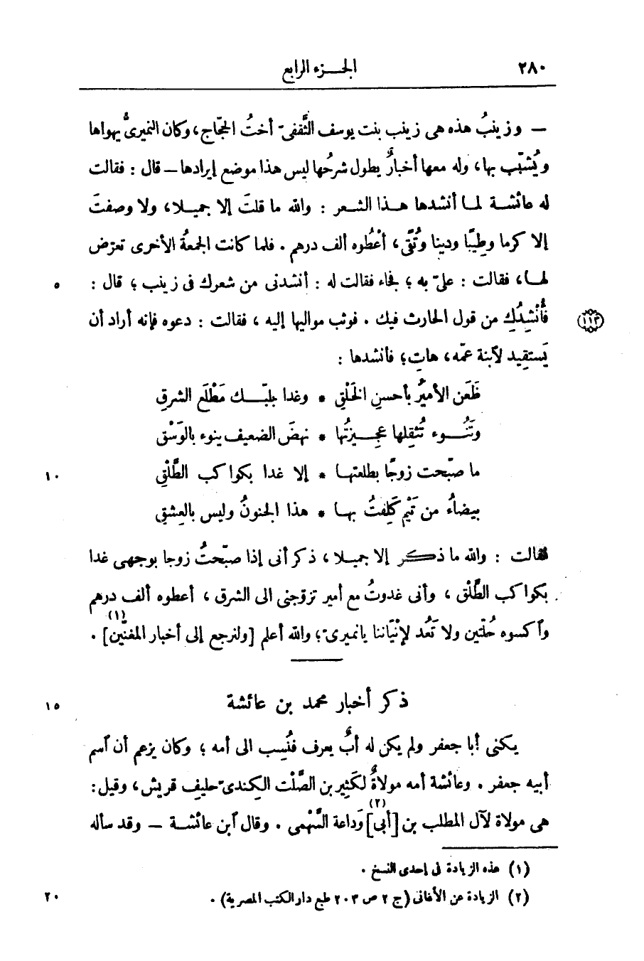 - وزينب هذه هى زينب بنت يوسف الثّقفىّ أخت الحجّاج، وكان النميرىّ يهواها ويشبّب بها، وله معها أخبار يطول شرحها ليس هذا موضع إيرادها- قال: فقالت له عائشة لما أنشدها هذا الشعر: والله ما قلت إلا جميلا، ولا وصفت إلا كرما وطيّبا ودينا وتقى، أعطوه ألف درهم. فلما كانت الجمعة الأخرى تعرّض لها، فقالت: علىّ به؛ فجاء فقالت له: أنشدنى من شعرك في زينب؛ قال: