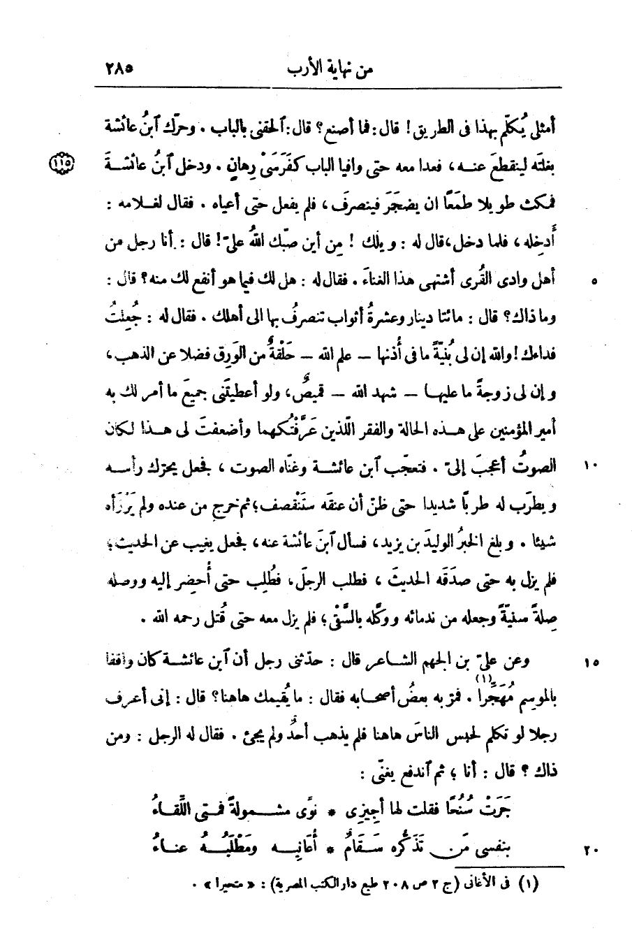 وما ذاك؟ قال: مائتا دينار وعشرة أثواب تنصرف بها الى أهلك. فقال له: جعلت فداءك! والله إن لى بنيّة ما في أذنها- علم الله- حلقة من الورق فضلا عن الذهب، وإن لى زوجة ما عليها- شهد الله- قميص، ولو أعطيتنى جميع ما أمر لك به أمير المؤمنين على هذه الحالة والفقر اللّذين عرّفتكهما وأضعفت لى هذا لكان الصوت أعجب إلىّ. فتعجّب ابن عائشة وغنّاه الصوت، فجعل يحرّك رأسه ويطرب له طربا شديدا حتى ظنّ أن عنقه ستنقصف؛ ثم خرج من عنده ولم يرزأه شيئا. وبلغ الخبر الوليد بن يزيد، فسأل ابن عائشة عنه، فجعل يغيب عن الحديث؛ فلم يزل به حتى صدقه الحديث، فطلب الرجل، فطلب حتى أحضر إليه ووصله صلة سنيّة وجعله من ندمائه ووكلّه بالسّقى؛ فلم يزل معه حتى قتل رحمه الله.
