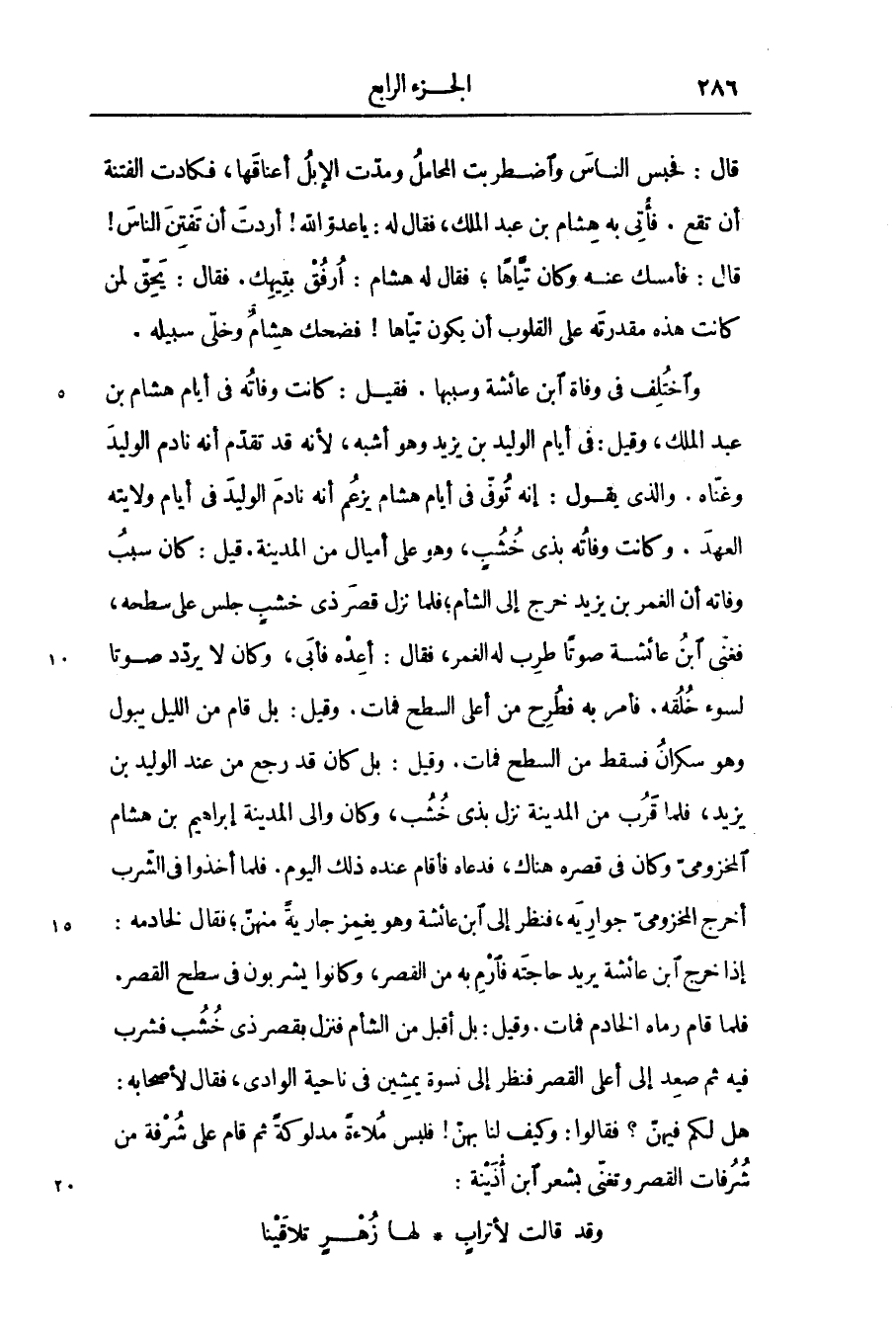 إذا خرج ابن عائشة يريد حاجته فارم به من القصر، وكانوا يشربون في سطح القصر، فلما قام رماه الخادم فمات. وقيل: بل أقبل من الشأم فنزل بقصر ذى خشب فشرب فيه ثم صعد إلى أعلى القصر فنظر إلى نسوة يمشين في ناحية الوادى، فقال لأصحابه: