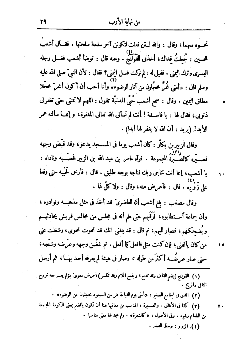 نحوه سهما، وقال: والله لئن فعلت لتكونن آخر سلحة سلحتها. فقال أشعب للحسين: جعلت فداك، أخذنى القولنج «1» . وعنه قال: توضأ أشعب فغسل رجله اليسرى وترك اليمنى. فقيل له: لم تركت غسل اليمنى؟ فقال: لأن النبىّ صلّى الله عليه وسلم قال: «أمتى غرّ محجّلون من آثار الوضوء «2» » وأنا أحب أن أكون أغرّ محجّلا مطلق اليمين. وقال: سمع أشعب حبّى المدنيّة تقول: اللهم لا تمتنى حتى تغفر لى ذنوبى؛ فقال لها: يا فاسقة! أنت لم تسألى الله تعالى المغفرة، وإنما سألته عمر الأبد! (يريد: أن الله لا يغفر لها أبدا) .