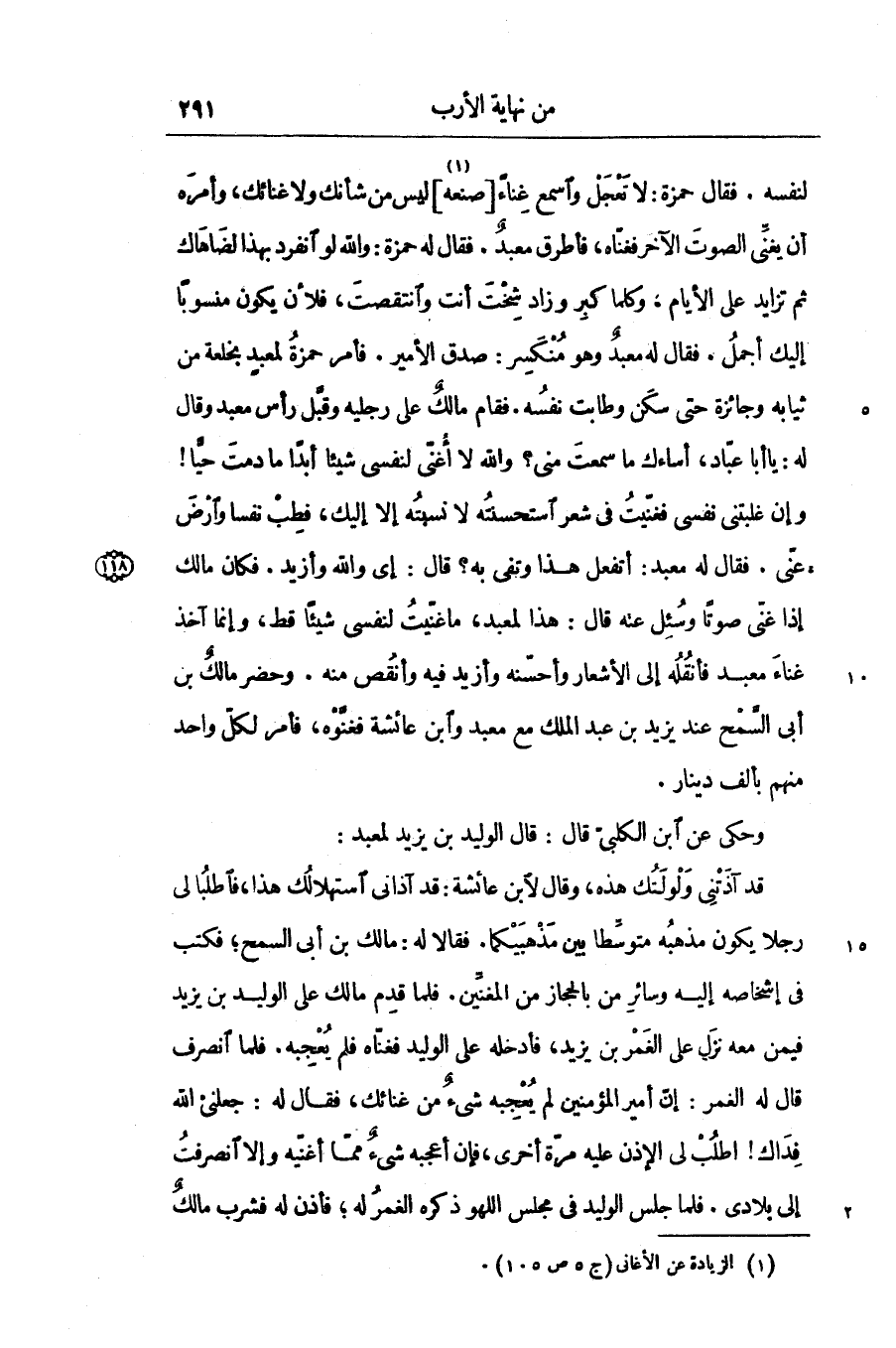 قد آذتنى ولولتك هذه، وقال لابن عائشة: قد آذانى استهلالك هذا، فاطلبا لى رجلا يكون مذهبه متوسّطا بين مذهبيكما. فقالا له: مالك بن أبى السمح؛ فكتب فى إشخاصه إليه وسائر من بالحجاز من المغنّين. فلما قدم مالك على الوليد بن يزيد فيمن معه نزل على الغمر بن يزيد، فأدخله على الوليد فغنّاه فلم يعجبه. فلما انصرف قال له الغمر: إنّ أمير المؤمنين لم يعجبه شىء من غنائك، فقال له: جعلنى الله فداك! اطلب لى الإذن عليه مرّة أخرى، فإن أعجبه شىء ممّا أغنّيه وإلا انصرفت إلى بلادى. فلما جلس الوليد في مجلس اللهو ذكره الغمر له؛ فأذن له فشرب مالك