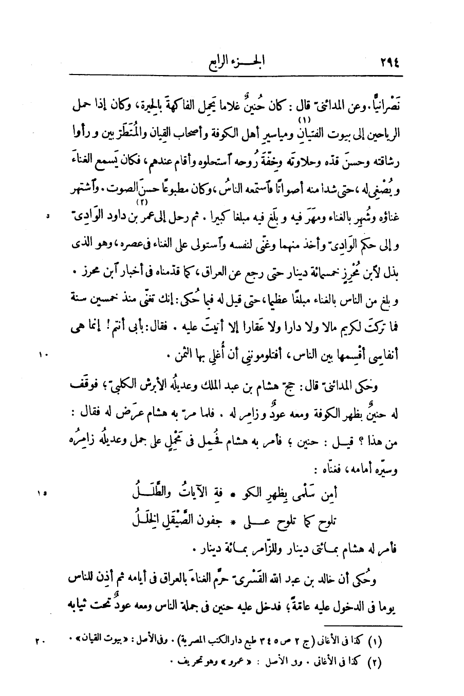 نصرانيّا. وعن المدائنىّ قال: كان حنين غلاما يحمل الفاكهة بالحيرة، وكان إذا حمل الرياحين إلى بيوت الفتيان «1» ومياسير أهل الكوفة وأصحاب القيان والمتطرّبين ورأوا رشاقته وحسن قدّه وحلاوته وخفّة روحه استحلوه وأقام عندهم، فكان يسمع الغناء ويصغى له، حتى شدا منه أصواتا فاستمعه الناس، وكان مطبوعا حسن الصوت. واشتهر غناؤه وشهر بالغناء ومهر فيه وبلغ فيه مبلغا كبيرا. ثم رحل إلى عمر «2» بن داود الوادى وإلى حكم الوادىّ وأخذ منهما وغنّى لنفسه واستولى على الغناء في عصره، وهو الذى بذل لابن محرز خمسمائة دينار حتى رجع عن العراق، كما قدّمناه في أخبار ابن محرز.