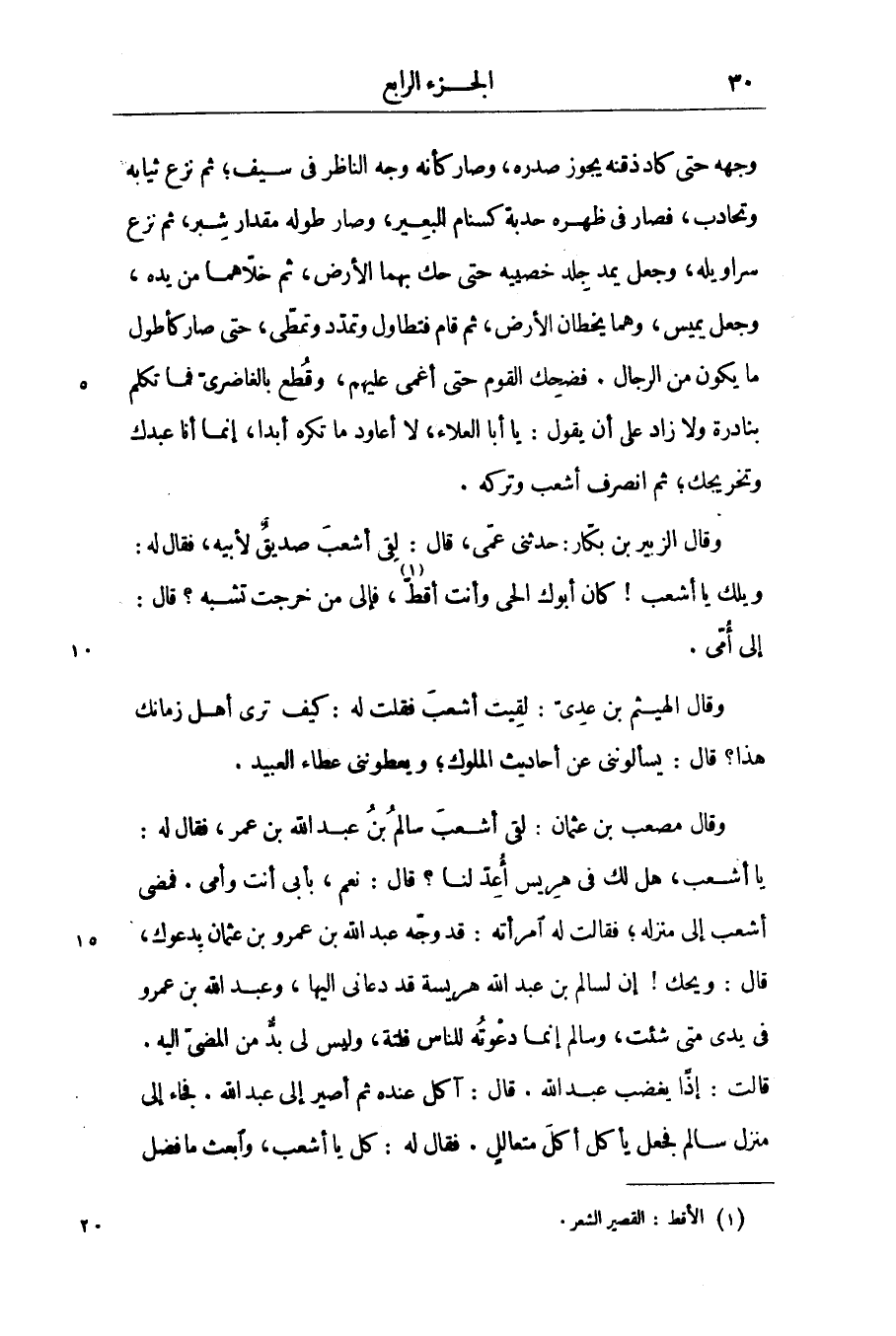 يا أشعب، هل لك في هريس أعدّ لنا؟ قال: نعم، بأبى أنت وأمى. فمضى أشعب إلى منزله؛ فقالت له امرأته: قد وجّه عبد الله بن عمرو بن عثمان يدعوك، قال: ويحك! إن لسالم بن عبد الله هريسة قد دعانى اليها، وعبد الله بن عمرو فى يدى متى شئت، وسالم إنما دعوته للناس فلتة، وليس لى بدّ من المضىّ اليه.