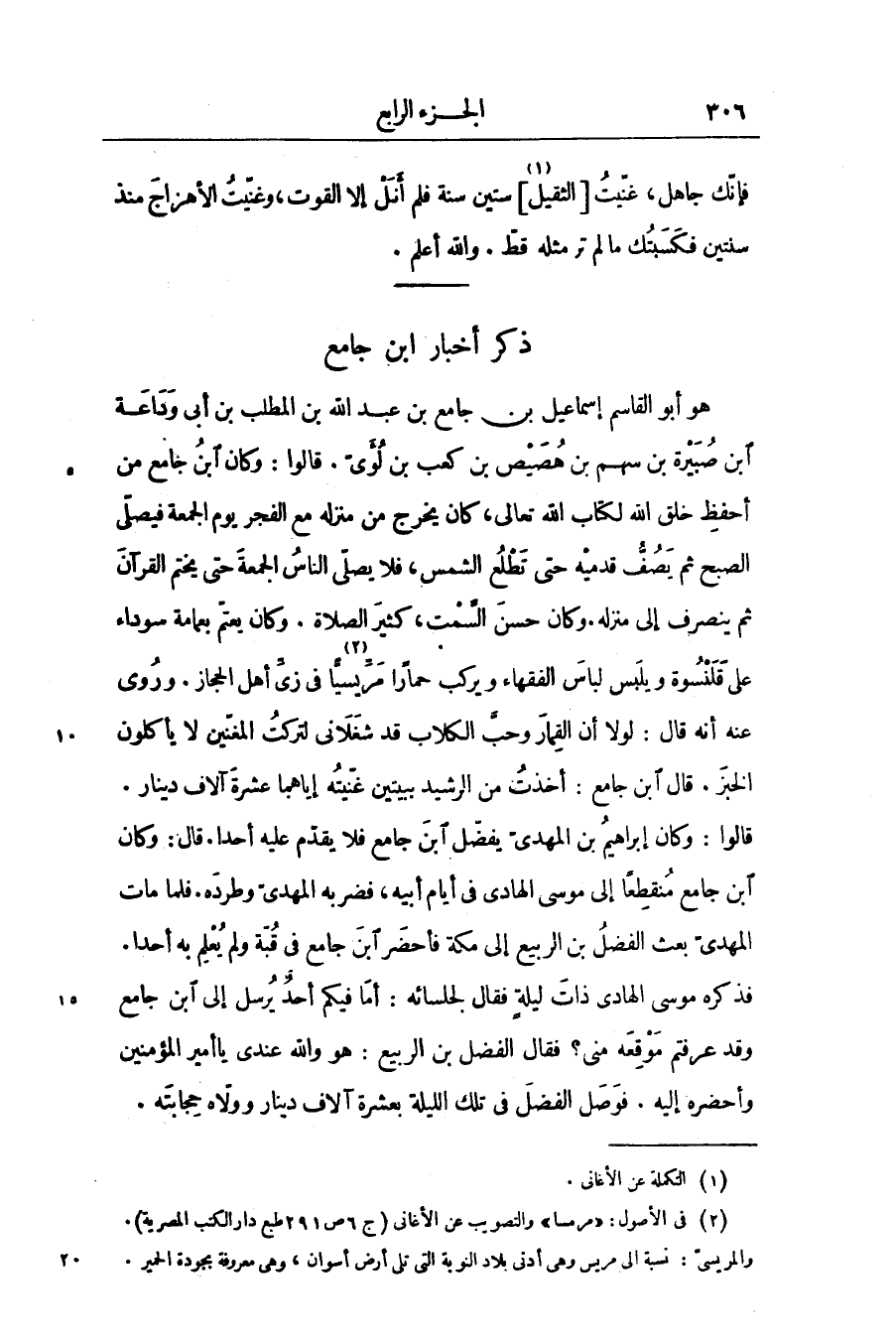 قالوا: وكان إبراهيم بن المهدىّ يفضّل ابن جامع فلا يقدّم عليه أحدا. قال: وكان ابن جامع منقطعا إلى موسى الهادى في أيام أبيه، فضربه المهدىّ وطرده. فلما مات المهدىّ بعث الفضل بن الربيع إلى مكة فأحضر ابن جامع في قبّة ولم يعلم به أحدا.
