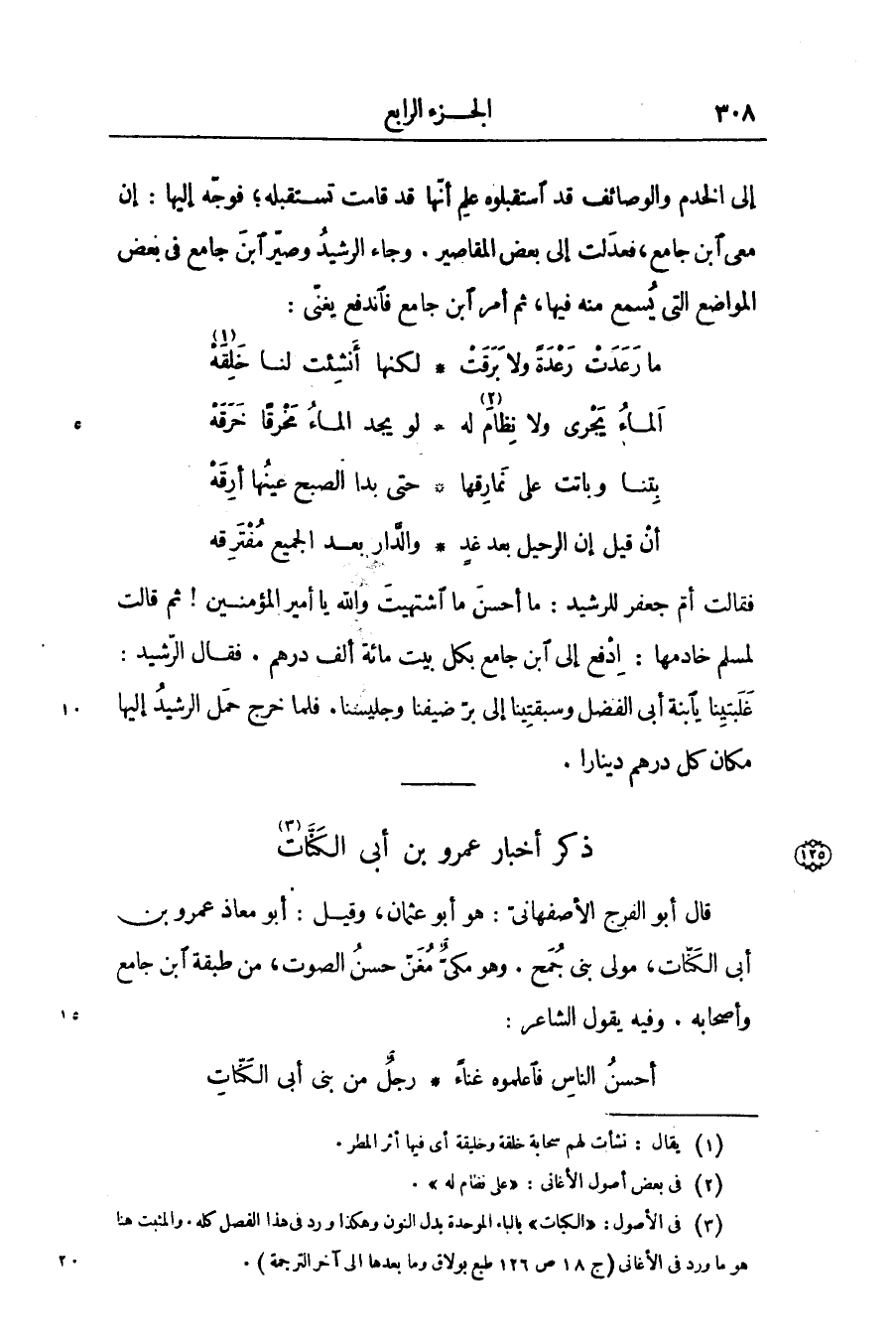 إلى الخدم والوصائف قد استقبلوه علم أنّها قد قامت تستقبله؛ فوجّه إليها: إن معى ابن جامع، فعدلت إلى بعض المقاصير. وجاء الرشيد وصيّر ابن جامع في بعض المواضع التى يسمع منه فيها، ثم أمر ابن جامع فاندفع يغنّى: