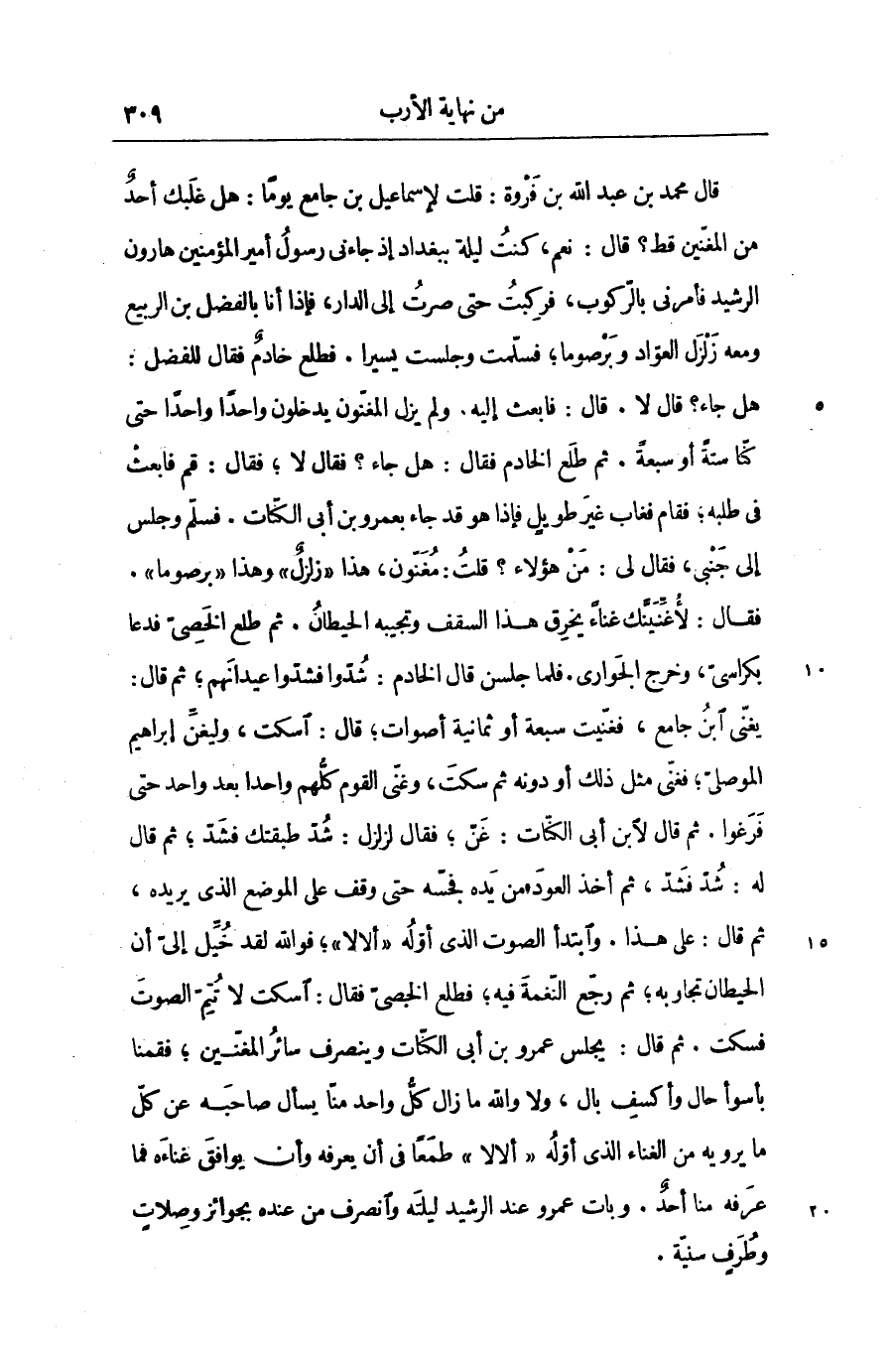 هل جاء؟ قال لا. قال: فابعث إليه. ولم يزل المغنّون يدخلون واحدا واحدا حتى كنّا ستّة أو سبعة. ثم طلع الخادم فقال: هل جاء؟ فقال لا؛ فقال: قم فابعث فى طلبه؛ فقام فغاب غير طويل فإذا هو قد جاء بعمرو بن أبى الكنّات. فسلّم وجلس إلى جنبى، فقال لى: من هؤلاء؟ قلت: مغنّون، هذا «زلزل» وهذا «برصوما» .