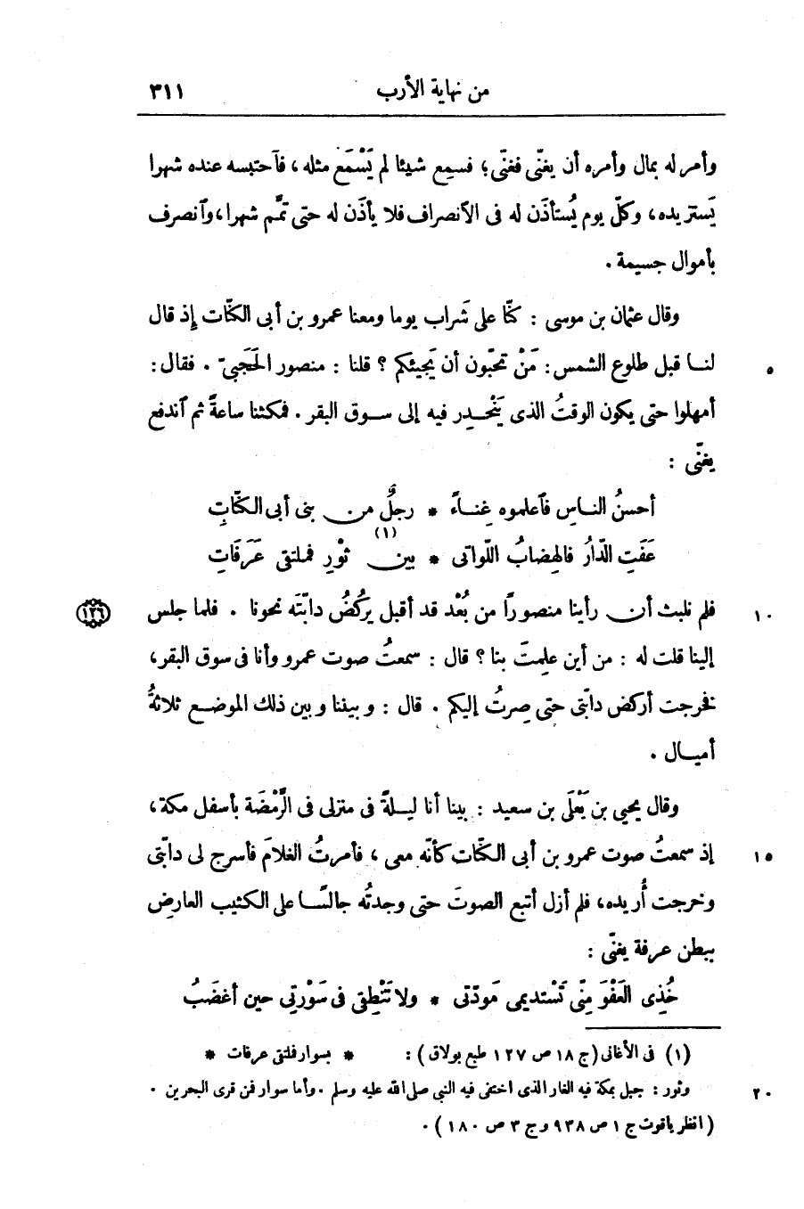 وقال يحيى بن يعلى بن سعيد: بينا أنا ليلة في منزلى في الرّمضة بأسفل مكة، إذ سمعت صوت عمرو بن أبى الكنّات كأنّه معى، فأمرت الغلام فأسرج لى دابّتى وخرجت أريده، فلم أزل أتبع الصوت حتى وجدته جالسا على الكثيب العارض ببطن عرفة يغنّى: