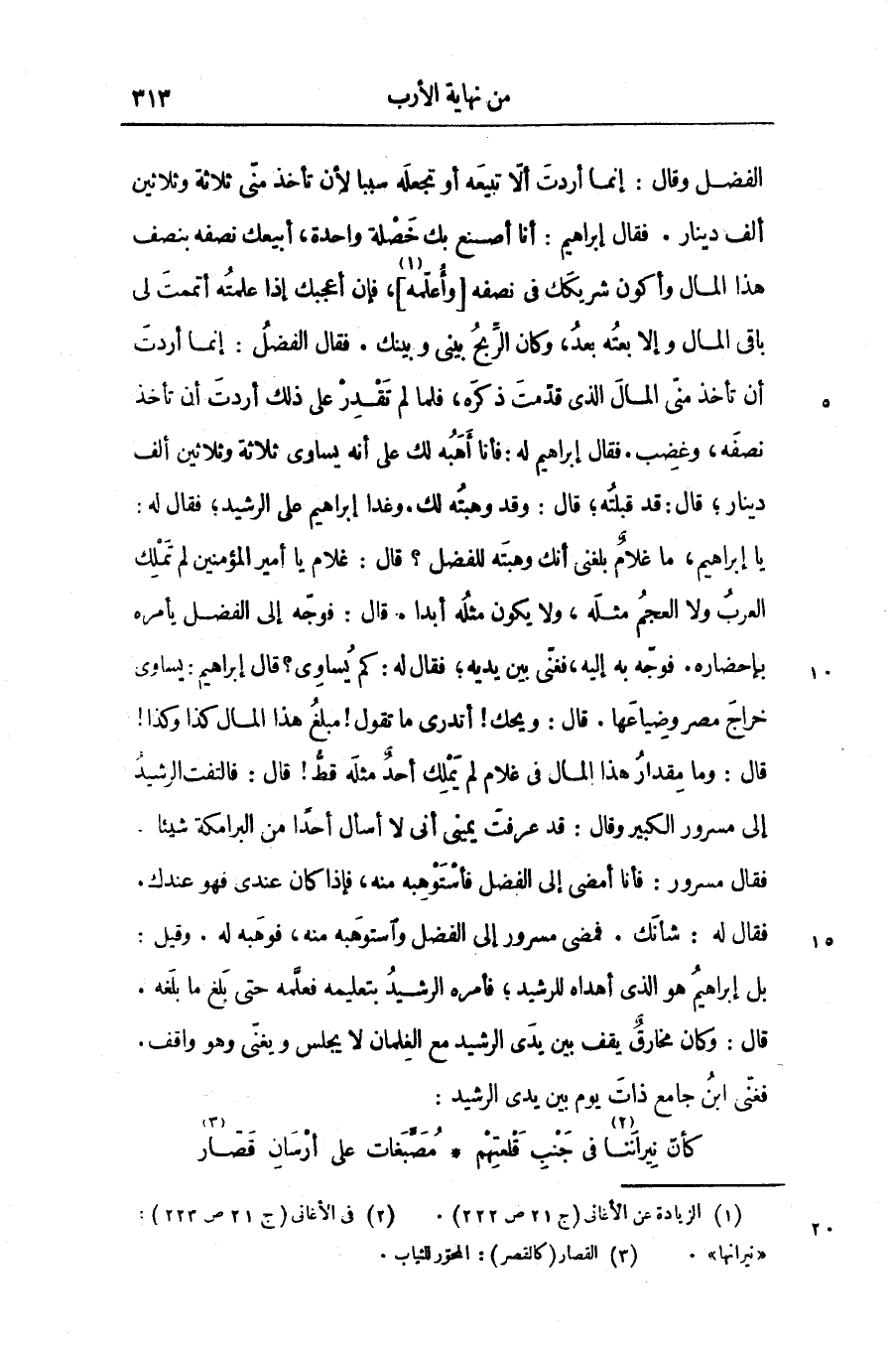 الفضل وقال: إنما أردت ألّا تبيعه أو تجعله سببا لأن تأخذ منّى ثلاثة وثلاثين ألف دينار. فقال إبراهيم: أنا أصنع بك خصلة واحدة، أبيعك نصفه بنصف هذا المال وأكون شريكك في نصفه [وأعلّمه «1» ] ، فإن أعجبك إذا علمته أتممت لى باقى المال وإلا بعته بعد، وكان الرّبح بينى وبينك. فقال الفضل: إنما أردت أن تأخذ منّى المال الذى قدّمت ذكره، فلما لم تقدر على ذلك أردت أن تأخذ نصفه، وغضب. فقال إبراهيم له: فأنا أهبه لك على أنه يساوى ثلاثة وثلاثين ألف دينار؛ قال: قد قبلته؛ قال: وقد وهبته لك. وغدا إبراهيم على الرشيد؛ فقال له: