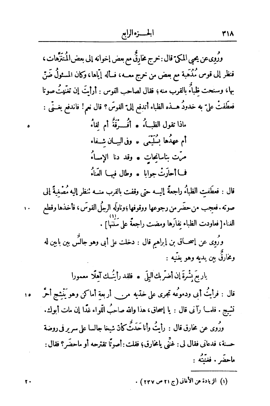 قال: فعطفت الظباء راجعة إليه حتى وقفت بالقرب منه تنظر إليه مصغية إلى صوته. فعجب من حضر من رجوعها ووقوفها؛ وناوله الرجل القوس، فأخذها وقطع الغناء [فعاودت الظباء نفارها ومضت راجعة على سننها «1» ] .