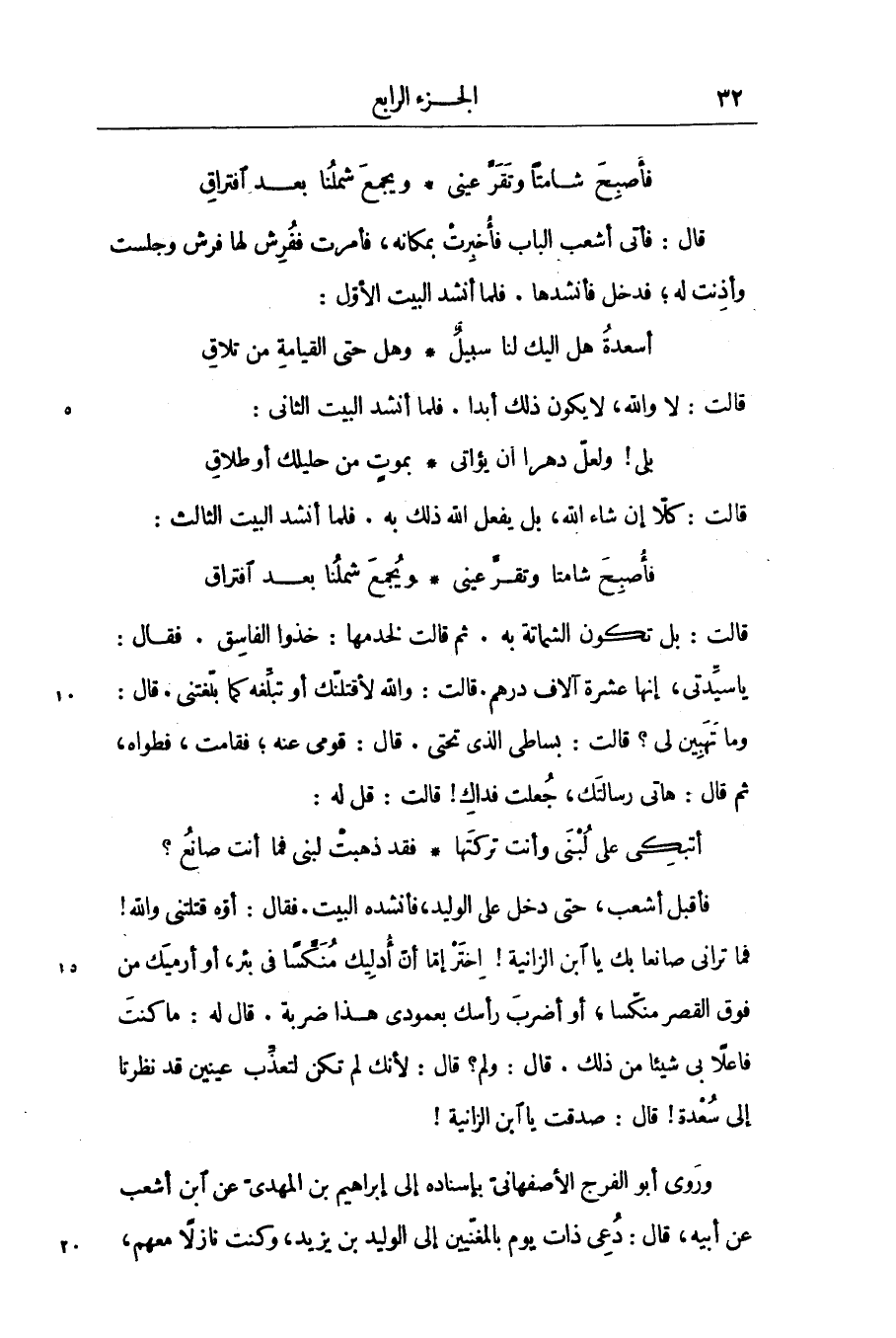 فأقبل أشعب، حتى دخل على الوليد، فأنشده البيت. فقال: أوّه قتلتنى والله! فما ترانى صانعا بك يا ابن الزانية! اختر إمّا أنّ أدليك منكّسا في بئر، أو أرميك من فوق القصر منكّسا، أو أضرب رأسك بعمودى هذا ضربة. قال له: ما كنت فاعلا بى شيئا من ذلك. قال: ولم؟ قال: لأنك لم تكن لتعذّب عينين قد نظرتا إلى سعدة! قال: صدقت يا ابن الزانية! وروى أبو الفرج الأصفهانىّ بإسناده إلى إبراهيم بن المهدىّ عن ابن أشعب عن أبيه، قال: دعى ذات يوم بالمغنّيين إلى الوليد بن يزيد، وكنت نازلا معهم،