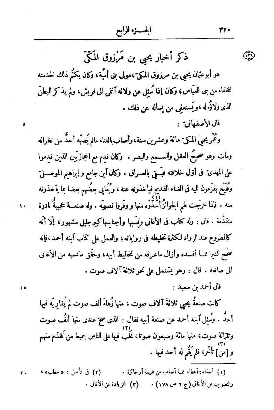 وعمّر يحيى المكىّ مائة وعشرين سنة، وأصاب بالغناء ما لم يصبه أحد من نظرائه ومات وهو صحيح العقل والسمع والبصر. وكان قدم مع الحجازيّين الذين قدموا على المهدىّ في أوّل خلافته فبقى بالعراق. وكان ابن جامع وإبراهيم الموصلىّ وفليح يفزعون اليه في الغناء القديم فيأخذونه عنه، ويعابى بعضهم بعضا بما يأخذونه منه. فإذا خرجت لهم الجوائز أحذوه «1» منها ووفّروا نصيبه. وله صنعة عجيبة نادرة متقدّمة. قال: وله كتاب في الأغانى ونسبها وأجناسها كبير جليل مشهور، إلّا أنّه كالمطروح عند الرواة لكثرة تخليطه في رواياته؛ والعمل على كتاب ابنه أحمد، فإنه صحّح كثيرا مما أفسده وأزال ما عرفه من تخاليط أبيه، وحقّق ما نسبه من الأغانى الى صانعه. قال: وهو يشتمل على نحو ثلاثة آلاف صوت.