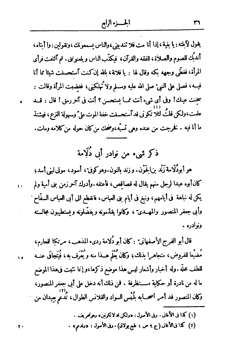 قال أبو الفرج الأصفهانىّ: كان أبو دلامة ردىء المذهب، مرتكبا للمحارم، مضيّعا للفروض، متجاهرا بذلك؛ وكان يعلم هذا منه ويعرف به، فيتجافى عنه للطف محلّه. وله أخبار وأشعار ليس هذا موضع ذكرها، وإنما نثبت في هذا الموضع ما له من نادرة أو حكاية مستظرفة. فمن ذلك أنه دخل على أبى جعفر المنصور، وكان المنصور قد أمر أصحابه بلبس السواد والقلانس الطوال، تدعم «2» بعيدان من