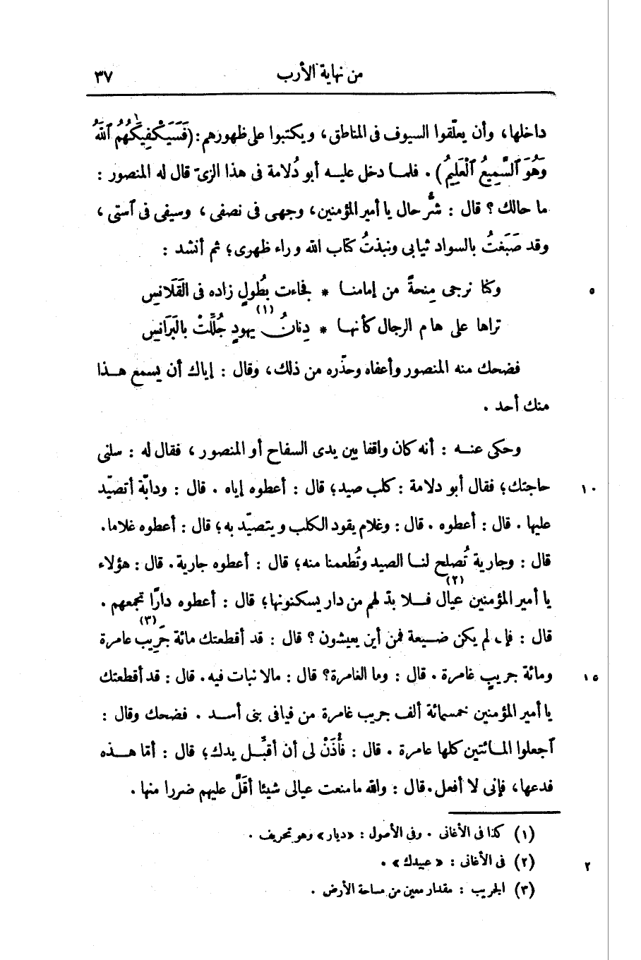 وحكى عنه: أنه كان واقفا بين يدى السفاح أو المنصور، فقال له: سلنى حاجتك؛ فقال أبو دلامة: كلب صيد؛ قال: أعطوه إياه. قال: ودابّة أتصيّد عليها. قال: أعطوه. قال: وغلام يقود الكلب ويتصيّد به؛ قال: أعطوه غلاما.