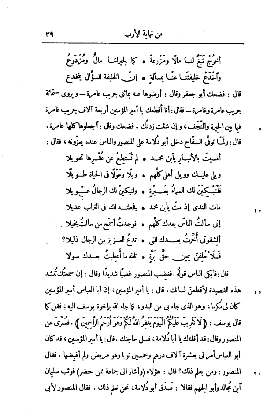 قال: فأبكى الناس قوله: فغضب المنصور غضبا شديدا وقال: إن سمعتك تنشد هذه القصيدة لأقطعنّ لسانك. قال: يا أمير المؤمنين، إنّ أبا العباس أمير المؤمنين كان لى مكرما، وهو الذى جاء بى من البدو، كما جاء الله بإخوة يوسف اليه؛ فقل كما قال يوسف: (لا تَثْرِيبَ عَلَيْكُمُ الْيَوْمَ يَغْفِرُ اللَّهُ لَكُمْ وَهُوَ أَرْحَمُ الرَّاحِمِينَ)