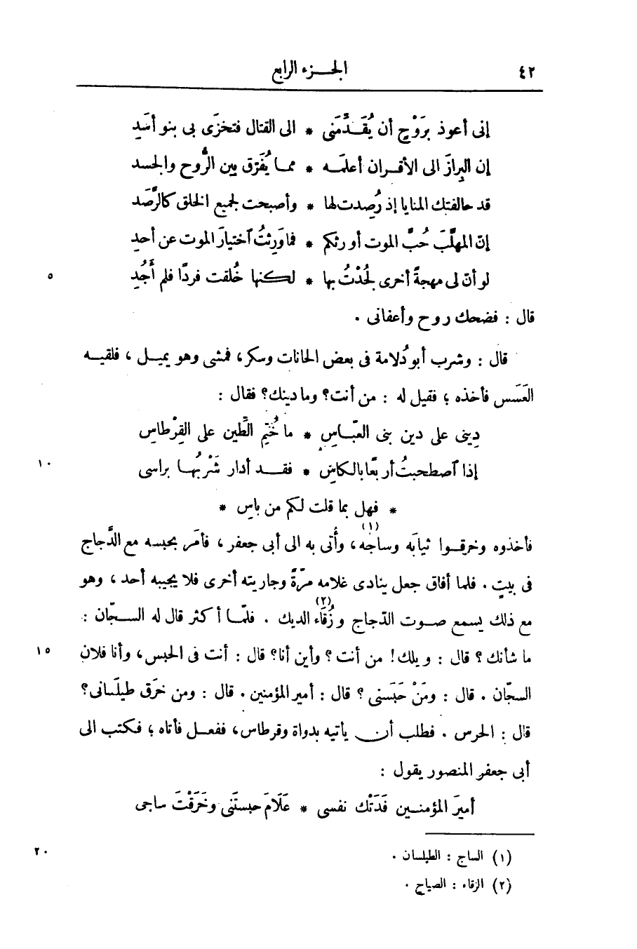 فأخذوه وخرقوا ثيابه وساجه «1» ، وأتى به الى أبى جعفر، فأمر بحبسه مع الدّجاج فى بيت. فلما أفاق جعل ينادى غلامه مرّة وجاريته أخرى فلا يجيبه أحد، وهو مع ذلك يسمع صوت الدّجاج وزقاء «2» الديك. فلمّا أكثر قال له السجّان: