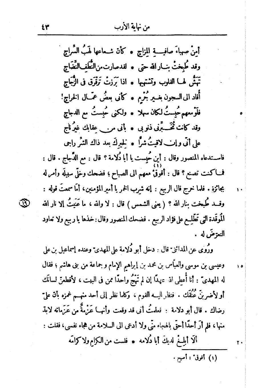 فاستدعاه المنصور وقال: أين حبست يا أبا دلامة؟ قال: مع الدّجاج. قال: