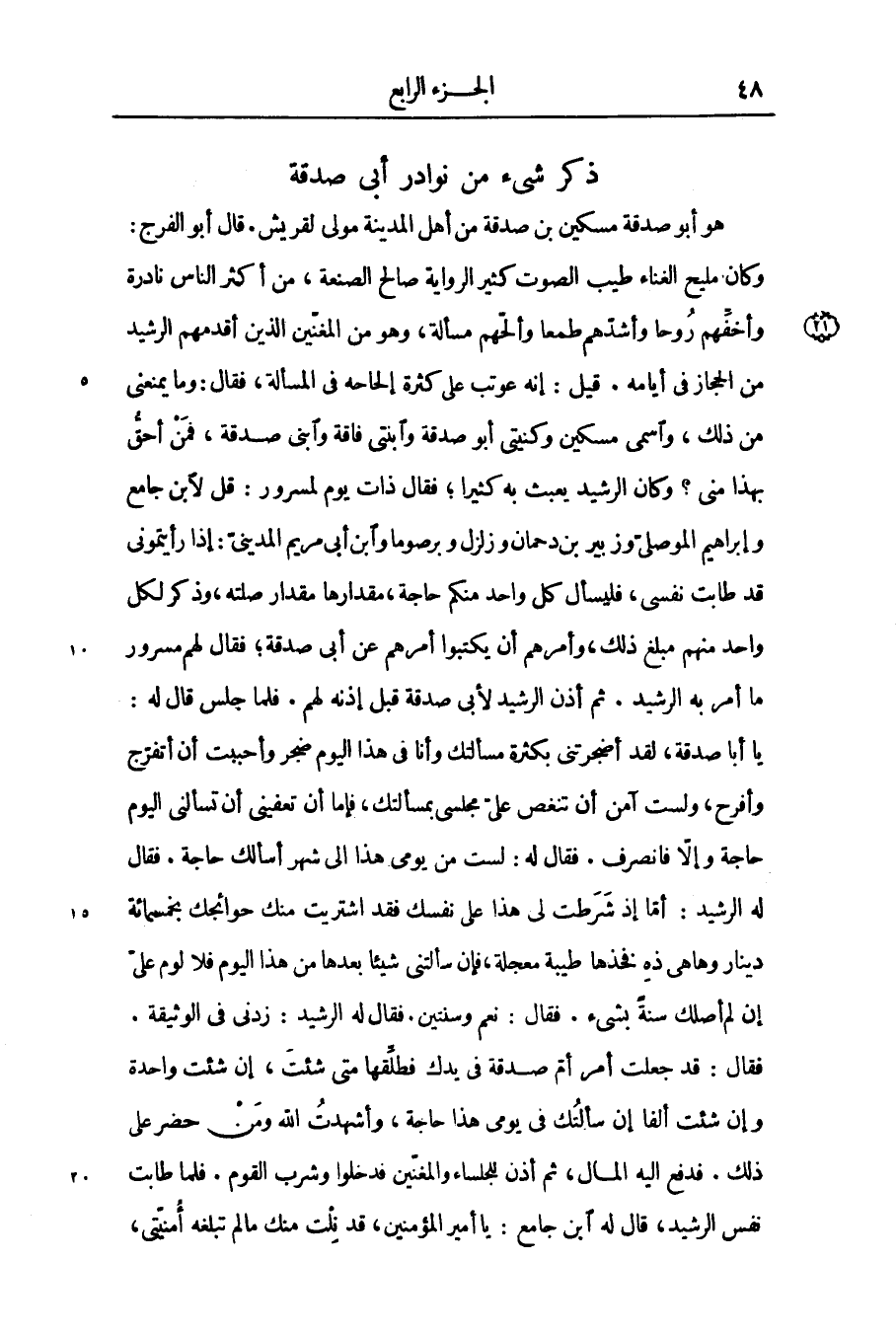 يا أبا صدقة، لقد أضجرتنى بكثرة مسألتك وأنا في هذا اليوم ضجر وأحببت أن أتفرّج وأفرح، ولست آمن أن تنغص علىّ مجلسى بمسألتك، فإما أن تعفينى أن تسألنى اليوم حاجة وإلّا فانصرف. فقال له: لست من يومى هذا الى شهر أسألك حاجة. فقال له الرشيد: أمّا إذ شرطت لى هذا على نفسك فقد اشتريت منك حوائجك بخمسمائة دينار وها هى ذه فخذها طيبة معجلة، فإن سألتنى شيئا بعدها من هذا اليوم فلا لوم علىّ إن لم أصلك سنة بشىء. فقال: نعم وسنتين. فقال له الرشيد: زدنى في الوثيقة.