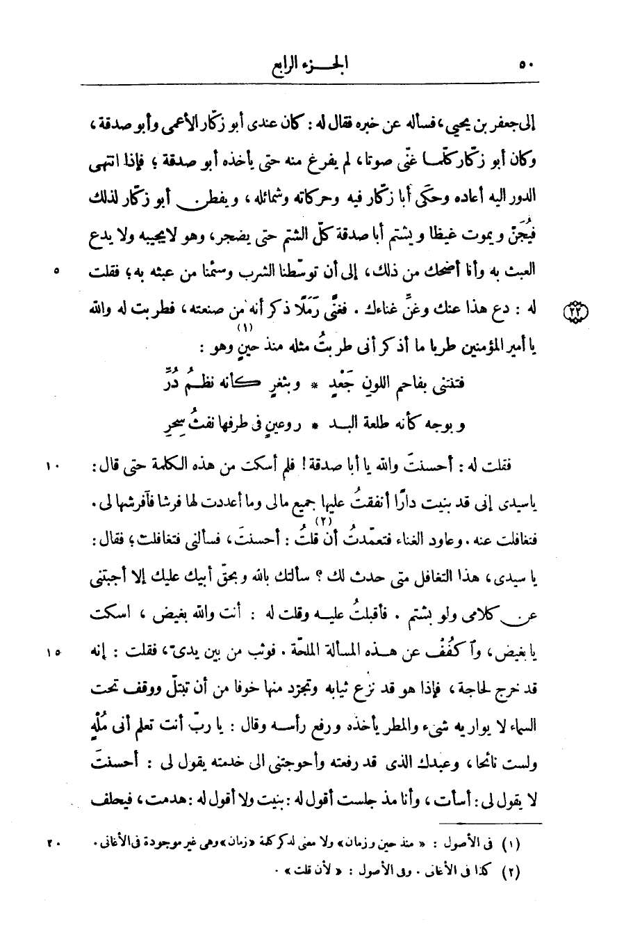إلى جعفر بن يحيى، فسأله عن خبره فقال له: كان عندى أبو زكّار الأعمى وأبو صدقة، وكان أبو زكّار كلّما غنّى صوتا، لم يفرغ منه حتى يأخذه أبو صدقة؛ فإذا انتهى الدور اليه أعاده وحكى أبا زكّار فيه وحركاته وشمائله، ويفطن أبو زكّار لذلك فيجنّ ويموت غيظا ويشتم أبا صدقة كلّ الشتم حتى يضجر، وهو لا يجيبه ولا يدع العبث به وأنا أضحك من ذلك، إلى أن توسّطنا الشرب وسمئنا من عبثه به؛ فقلت له: دع هذا عنك وغنّ غناءك. فغنّى رملا ذكر أنه من صنعته، فطربت له والله يا أمير المؤمنين طريا ما أذكر أنى طربت مثله منذ حين «1» وهو: