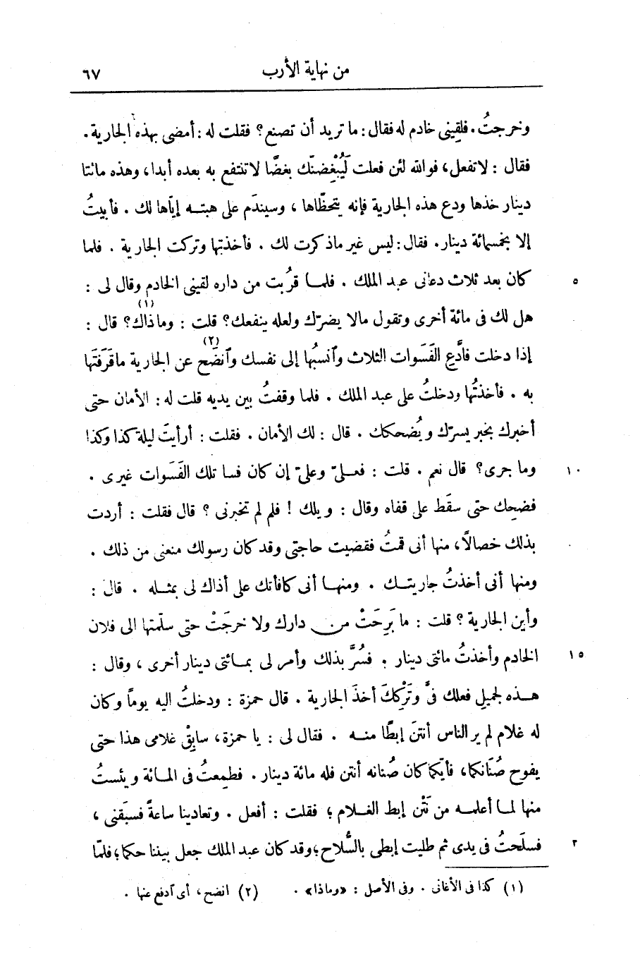 فقال: لا تفعل، فو الله لئن فعلت ليبغضنّك بغضا لا تنتفع به بعده أبدا، وهذه مائتا دينار خذها ودع هذه الجارية فإنه يتحظّاها، وسيندم على هبته إيّاها لك. فأبيت إلا بخمسمائة دينار. فقال: ليس غير ما ذكرت لك. فأخذتها وتركت الجارية. فلما كان بعد ثلاث دعانى عبد الملك. فلما قربت من داره لقينى الخادم وقال لى: